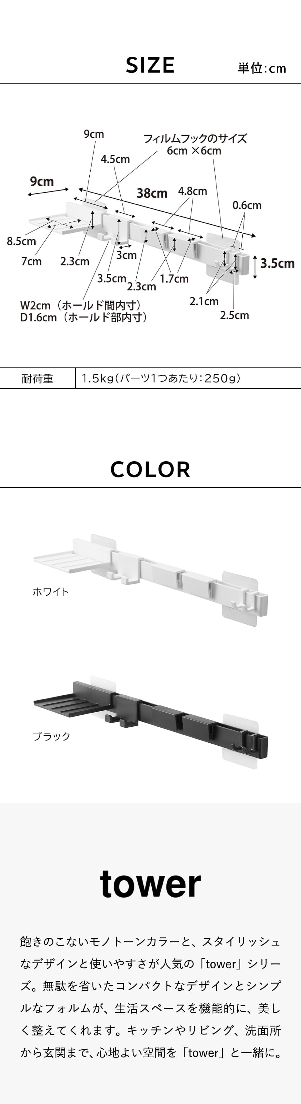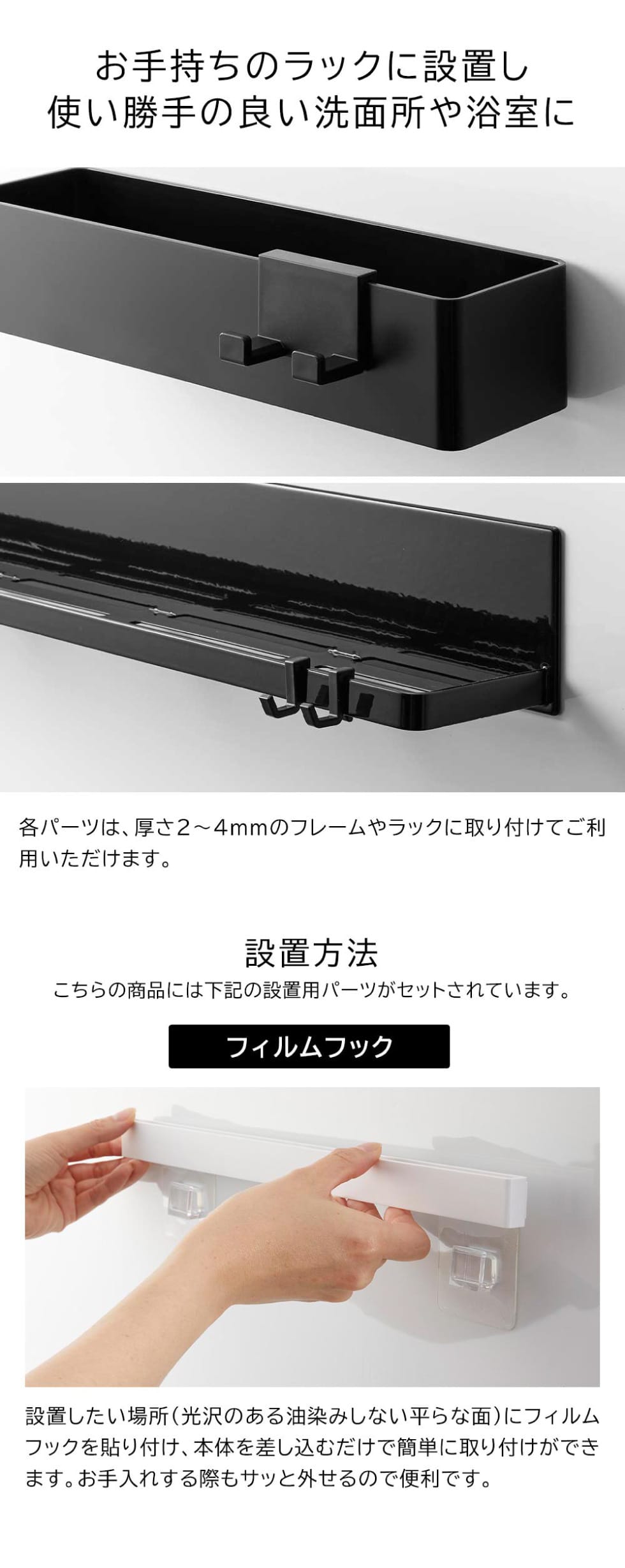 商品サイズ 本体(各パーツ取り付け時):W38×D9×H3.5cm(フィルムフック含まず) トレー:W9×D8×H2.3cm シェーバーハンガー:W4.5×D3×H3.5cm チューブハンガー:W4.8×D1.7×H2.3cm(1つあたり) フック:W0.6×D2.5×H2.1cm(1つあたり) フィルムフック接着面:W6×H6cm(1つあたり) |
