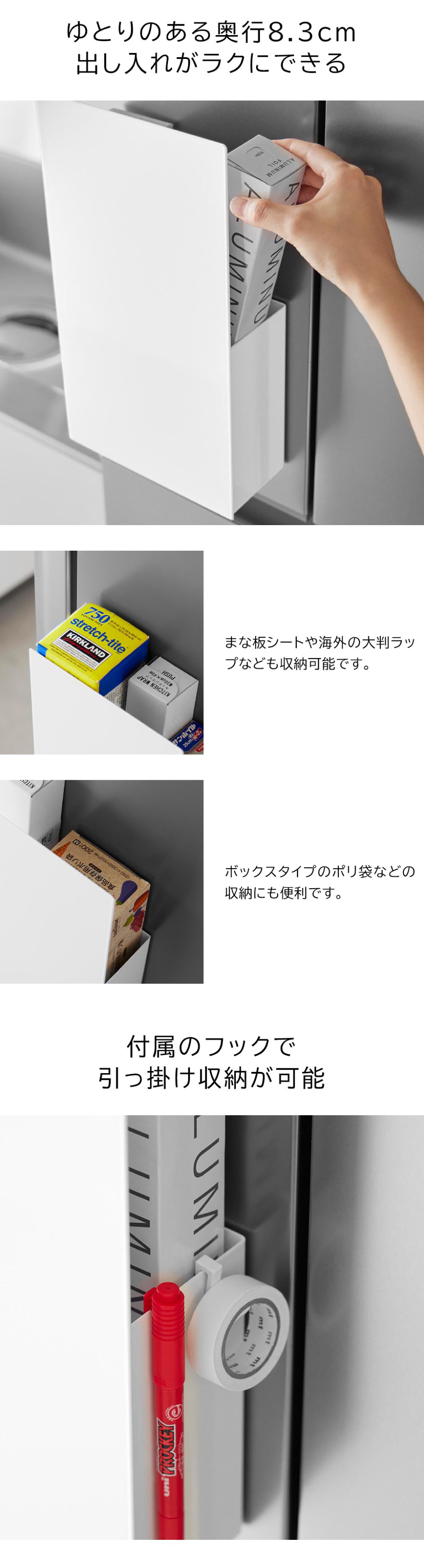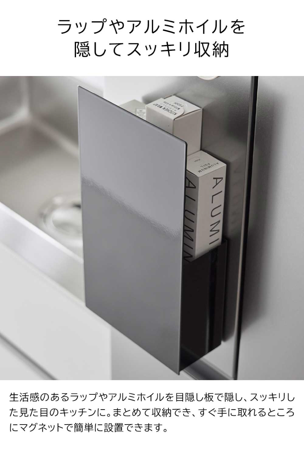 生活感のあるラップやアルミホイルを隠してスッキリ!まな板シートや大判ラップ、箱入りのポリ袋など厚みがあっても収納可能。手の届く範囲にラップホルダーをマグネットで簡単設置。