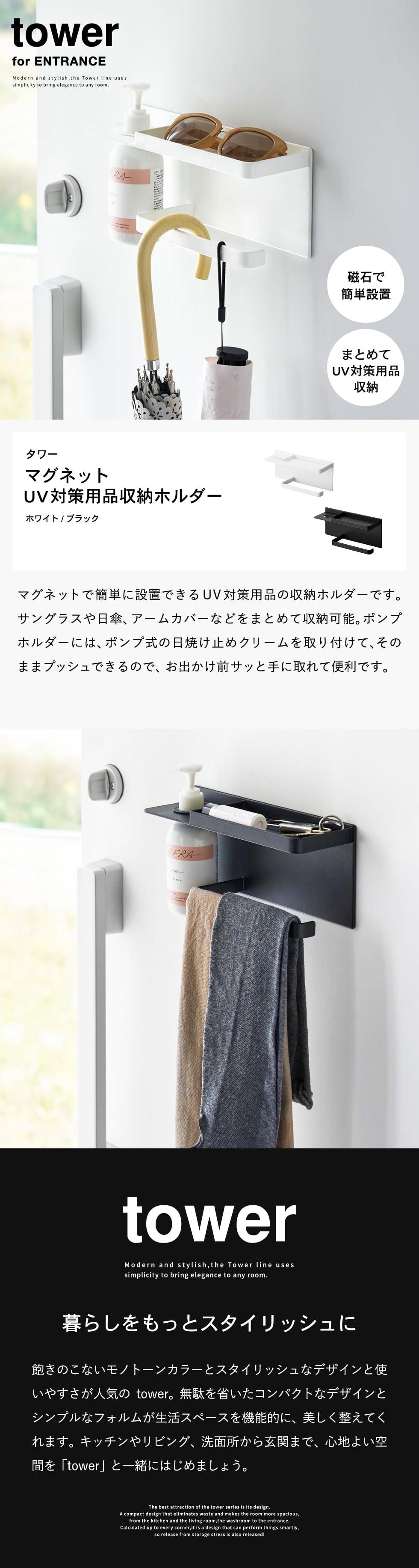 ホワイトとブラックを中心とした飽きのこないモノトーンカラーと、どんなインテリアにもスッと馴染むスタイリッシュなデザイン。そして、とことんシンプルながら、より豊かな暮らしを提案するアイデアがたくさん詰まった、使いやすいアイテムが人気です。無駄を省いたコンパクトなデザインと、シンプルなフォルムが生活スペースを機能的に、美しく整えてくれます。towerのアイテムをライン使いすれば、すっきりとした統一感が生まれ、お洒落でシックな雰囲気を演出します。キッチンやリビング、洗面所から玄関まで揃えたくなるtowerシリーズで、毎日の暮らしを彩る心地よい空間を。
