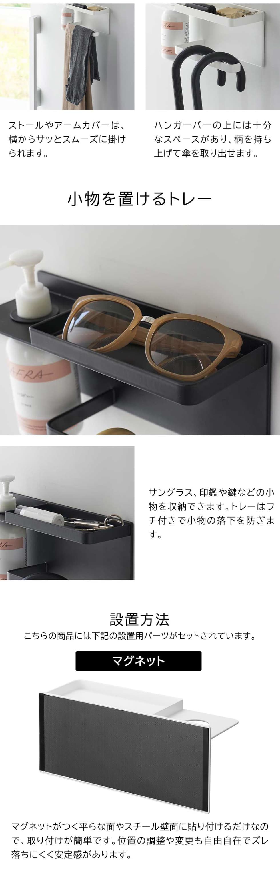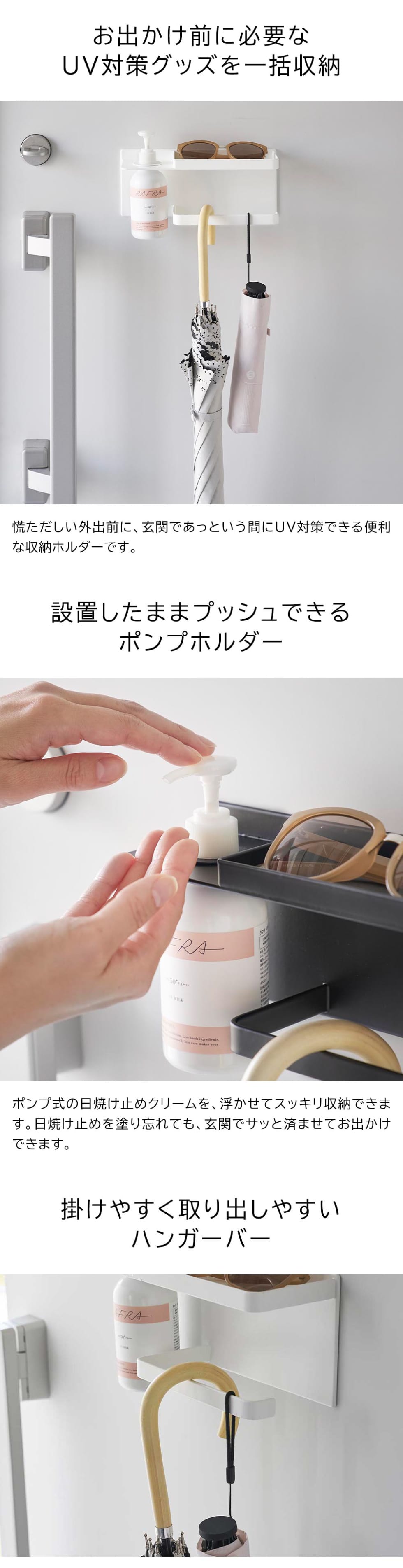 マグネットで玄関扉の裏などに簡単に設置できるUV対策用品の収納ホルダーです。トレーにはサングラスを始め日頃使う印鑑や鍵、ハンガー部分には日傘やアームカバー、ストールなどをまとめて収納可能。ポンプホルダーには、ポンプ式の日焼け止めクリームを取り付けて、そのままプッシュできるので、お出かけ前サッと手に取れて便利です。