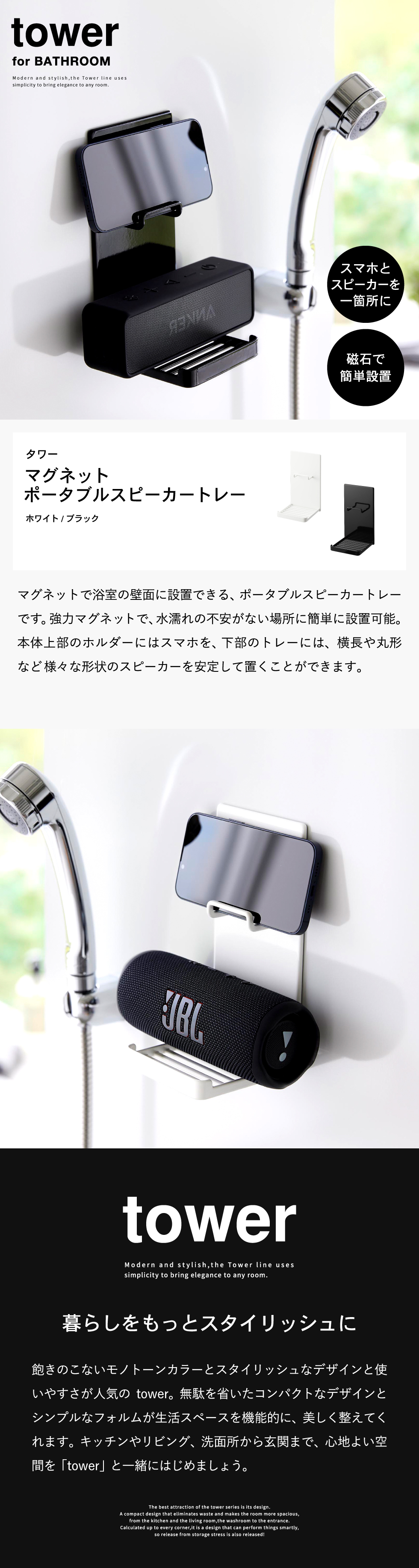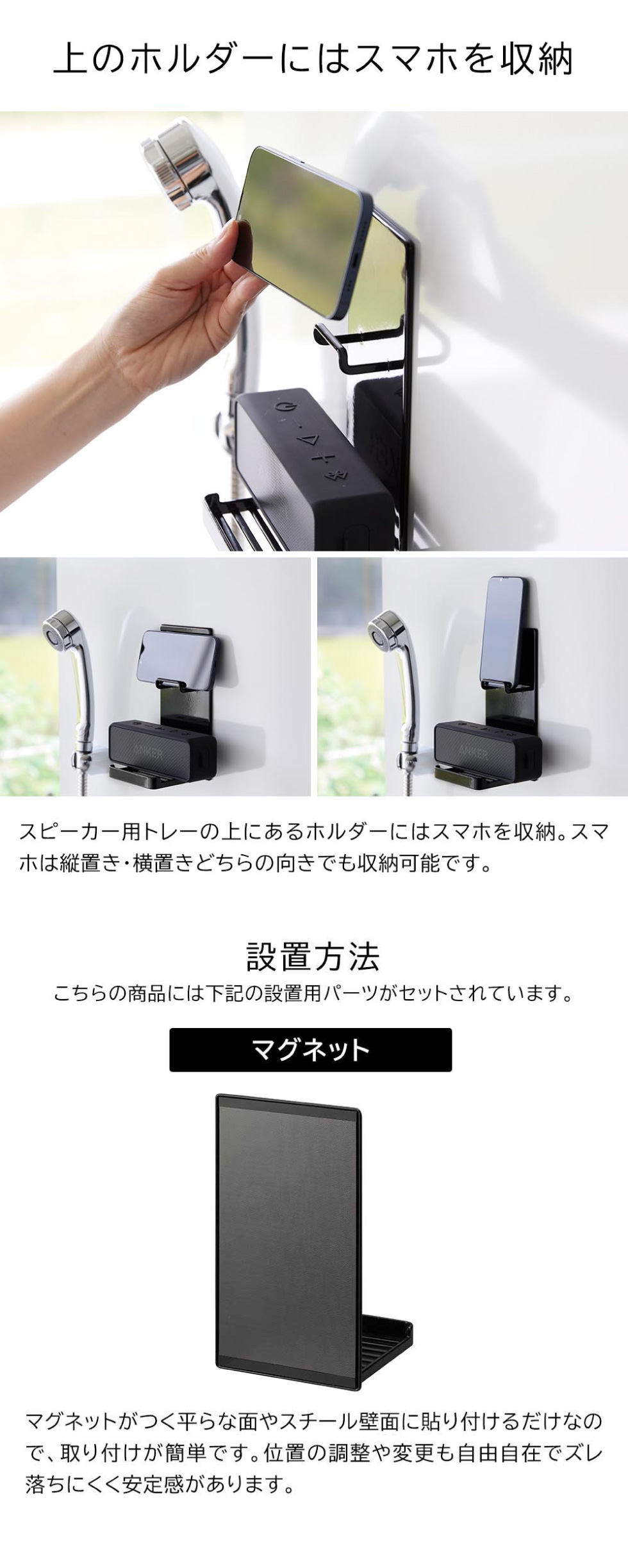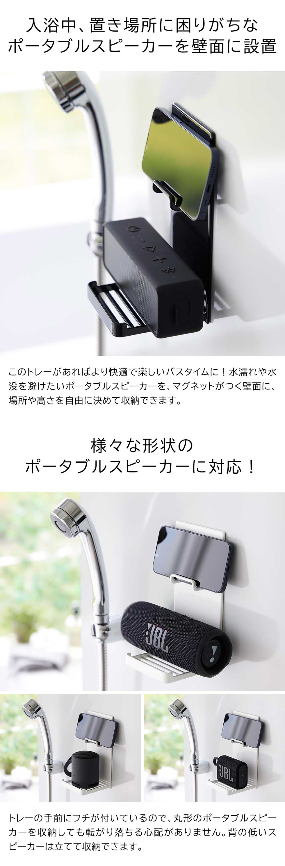 マグネットで浴室の壁面に設置できる、ポータブルスピーカートレーです。本体上部のホルダーにはスマホを、本体下部のトレーには、横長や丸形、背の低い物など、様々な形状のポータブルスピーカーを安定して置くことができます。スマホは縦横どちらの向きでも置くことが可能です。