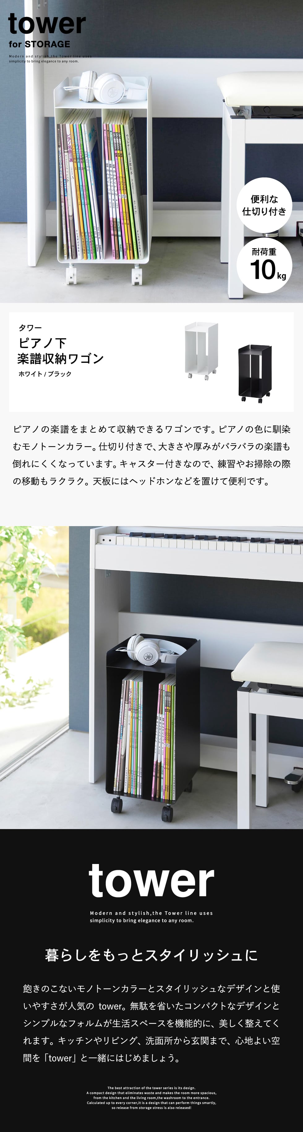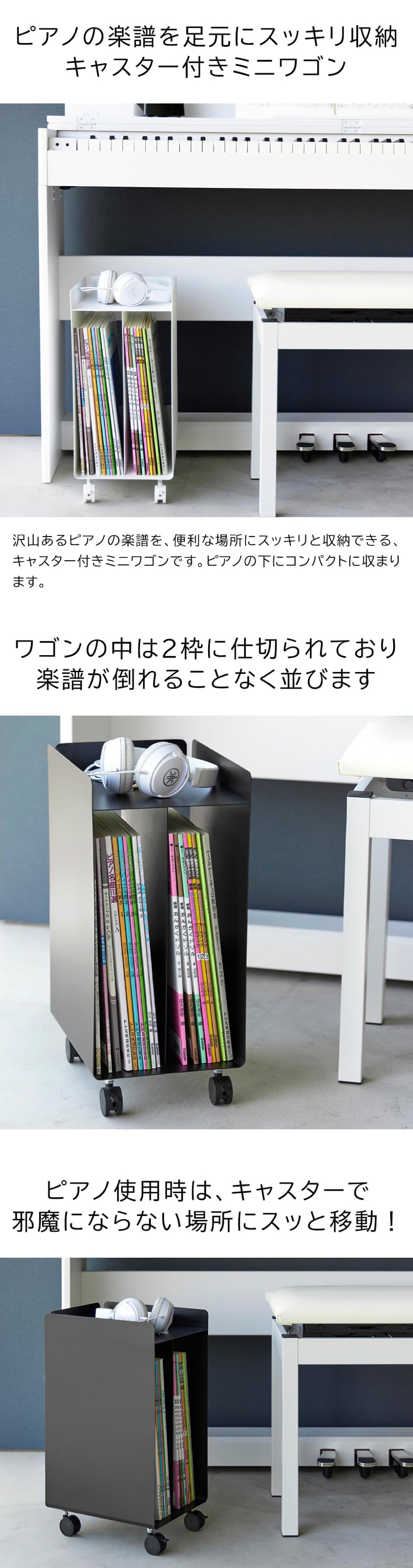 大きさも厚みもバラバラのピアノの楽譜を収納できるワゴンです。キャスター付きなので、普段はピアノの下に収納しておき、練習やお掃除の際はスムーズに移動できます。ワゴンの中は2つに仕切られており、プリントの楽譜も倒れにくいつくりになっています。モノトーンカラーのスタイリッシュな外観で、ピアノの色にもしっくりと馴染みます。天板にはヘッドホンやスマホ、メトロノームやキーカバー(ピアノを拭くクロス)などの小物を置けて便利です。