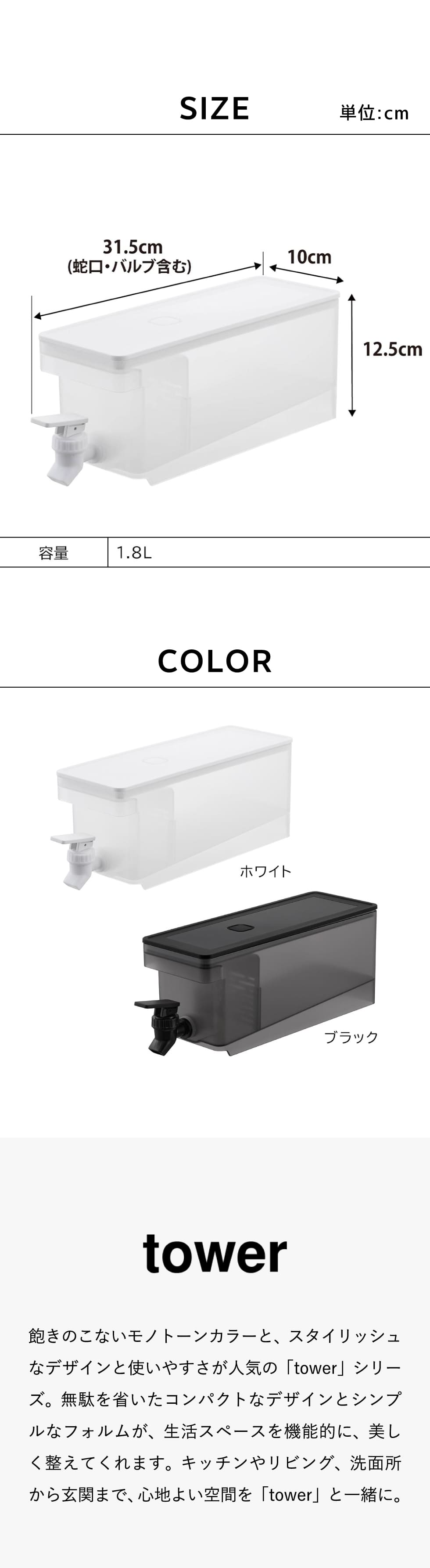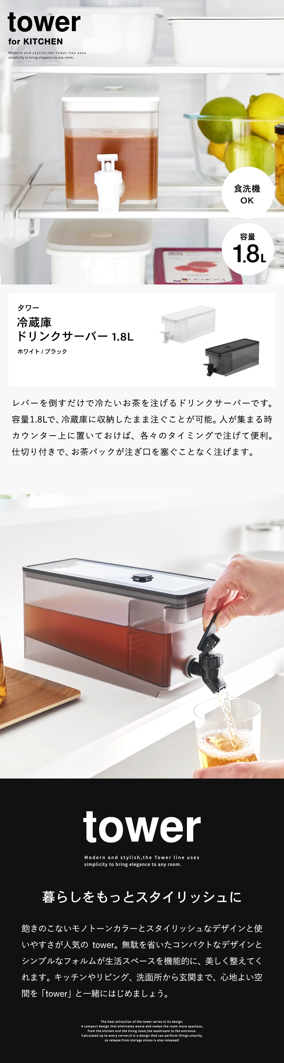 冷蔵庫ドリンクサーバー タワー 1.8L 山崎実業 tower 1584 1585 白 黒 送料無料