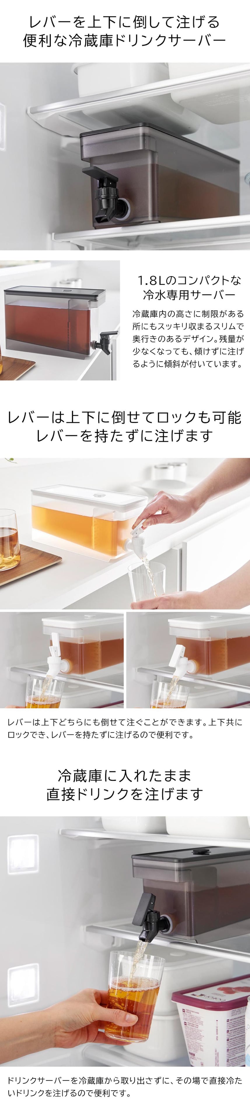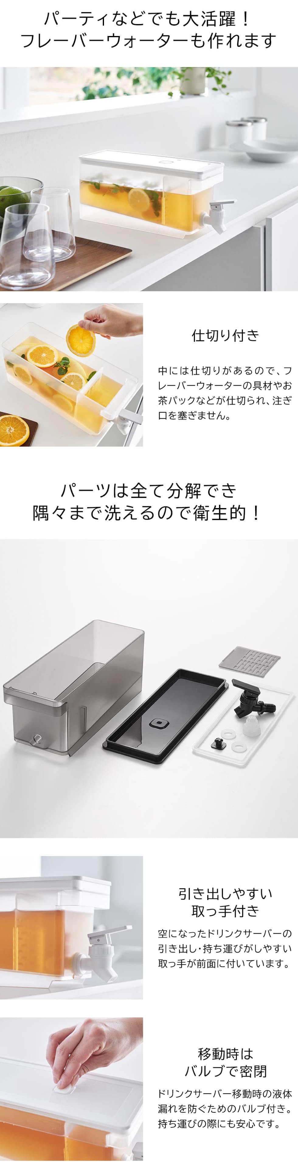 レバーを倒すだけで冷たいお茶を注げるドリンクサーバーです。冷蔵庫の奥行きを活かしたスリムな形状で、冷水筒を取り出すことなく冷蔵庫に収納したまま注げて便利。1.8Lのちょうどいい容量で、ホームパーティーなど人が集まる機会にも大活躍。キッチンカウンターに設置しておけば、それぞれ好きなタイミングで飲むことができます。お茶以外にも、フルーツティーやフレーバーウォーターを作って楽しめます。仕切り付きで、ティーパックや具材が注ぎ口を塞ぐことなく注げます。レバーは上下共にロックでき、手を離しても出続けるのも嬉しいポイント。容器の底は傾斜しており、残量が少なくなっても安定して注げます。パーツは全て分解でき、細かい部分まで洗えるので衛生的。食洗機もOKです。