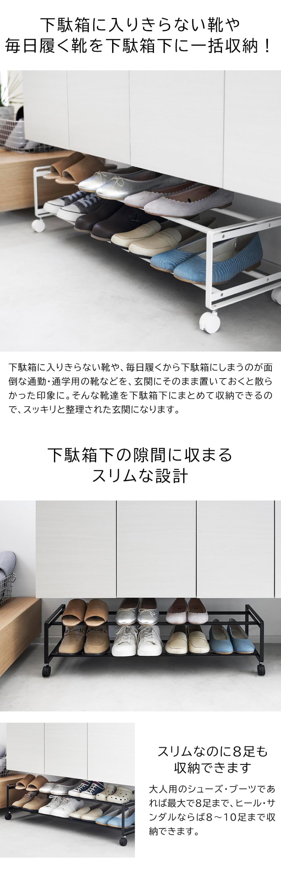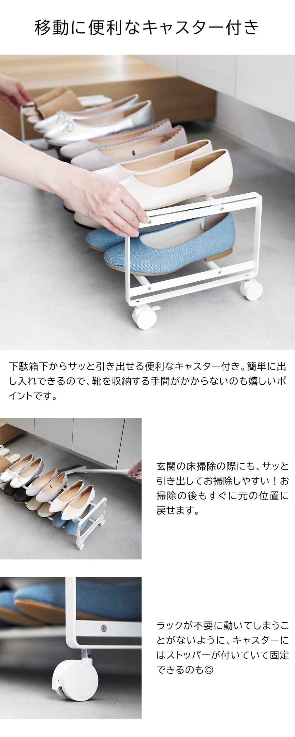 下駄箱下の隙間に収納できる2段のシューズラックです。下駄箱に入りきらなくなった靴はもちろん、毎日履く通勤や通学用の靴を収納しておけば朝のバタバタ忙しい時間もスムーズに。大人用の靴は8足、パンプスやサンダルなら8~10足まで収納できます。キャスター付きなので出し入れもラクラク。お出かけ時にキャスターを引き出して靴をサッと取り出したり、お掃除の際に移動しやすくて便利。キャスターは動かないようにストッパーも付いています。