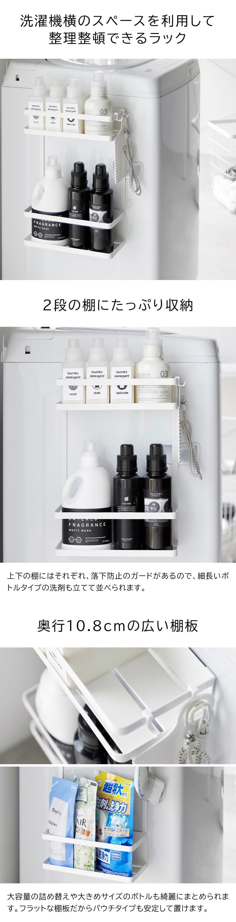 ■洗濯機横に簡単に設置できる大容量ラック マグネットで洗濯機横に簡単に設置できるラックです。奥行きが10.8cmで、特大サイズの詰め替えパックやボトル類、ヘアドライヤーもすっぽり収まる大容量。上下段それぞれに落下防止のガードが付いており、ボトルや液体洗剤のパックも立てて収納できます。付属のフックを取り付ければ、お掃除ブラシや洗濯ネット、輪ゴムなど、小物の引っ掛け収納も可能。洗濯小物以外にもヘアドライヤーや化粧品などの収納にも便利です。