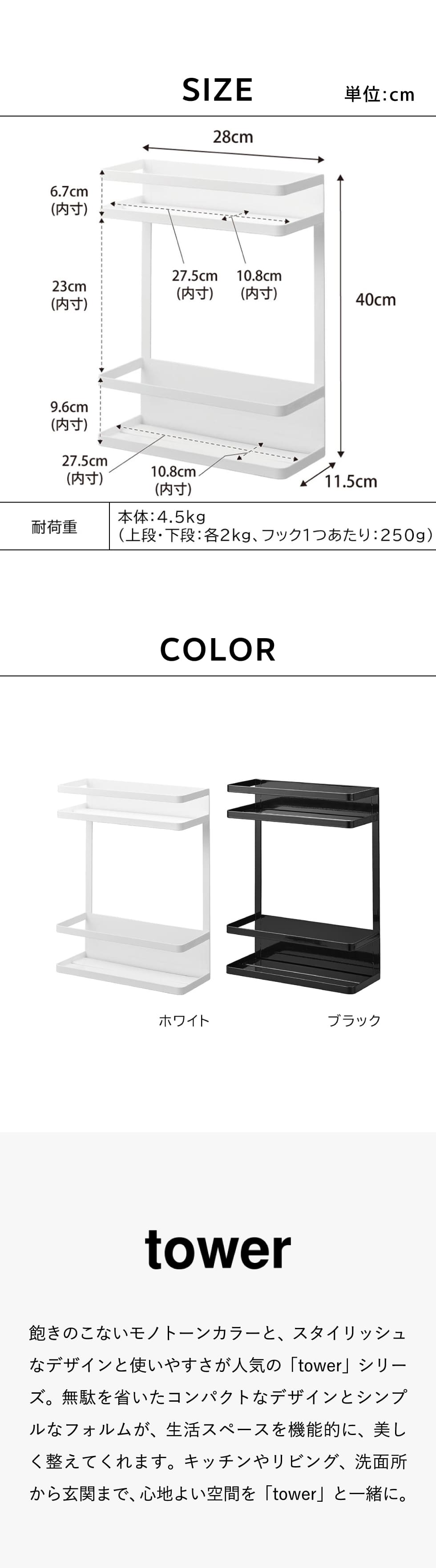 tower(タワー)について 創業60年を超える歴史あるインテリアの雑貨メーカー、山崎実業から生まれたインテリア雑貨ブランド。 “暮らしをもっとスタイリッシュに” ホワイトとブラックを中心とした飽きのこないモノトーンカラーと、どんなインテリアにもスッと馴染むスタイリッシュなデザイン。そして、とことんシンプルながら、より豊かな暮らしを提案するアイデアがたくさん詰まった、使いやすいアイテムが人気です。無駄を省いたコンパクトなデザインと、シンプルなフォルムが生活スペースを機能的に、美しく整えてくれます。towerのアイテムをライン使いすれば、すっきりとした統一感が生まれ、お洒落でシックな雰囲気を演出します。キッチンやリビング、洗面所から玄関まで揃えたくなるtowerシリーズで、毎日の暮らしを彩る心地よい空間を。 長く使えるモダンなインテリアは、ご自宅用だけでなく、新生活を始めるご家族・ご友人へのプレゼントとして、引っ越し祝い・結婚祝いのギフトにもおすすめです。