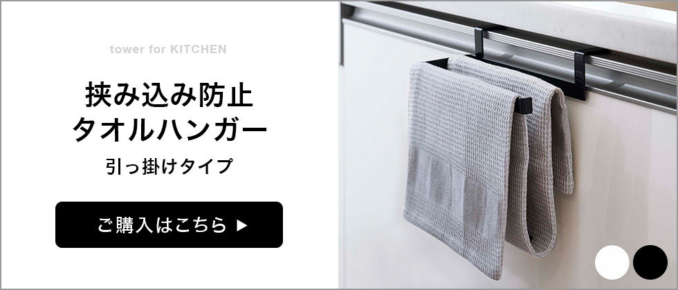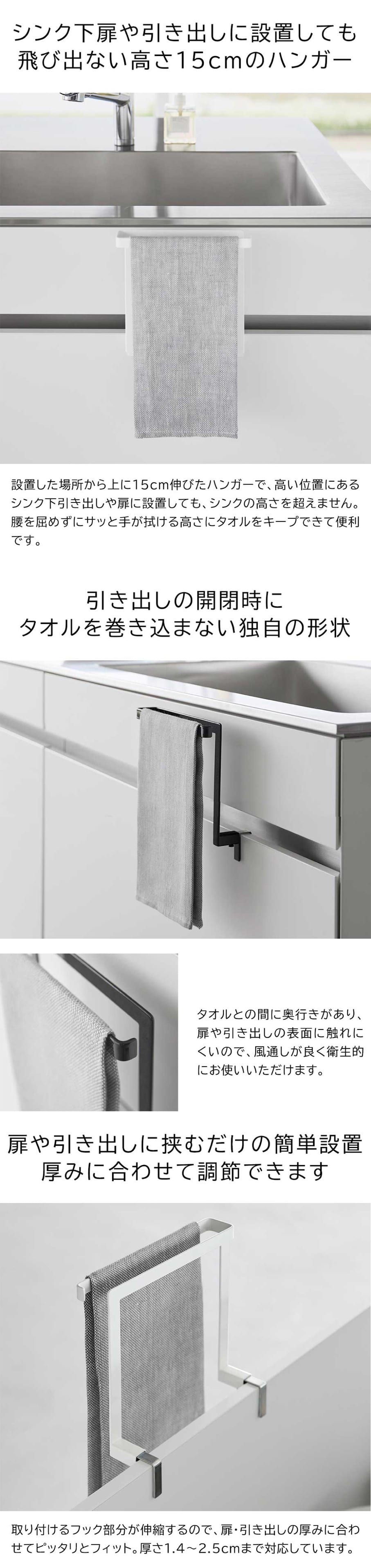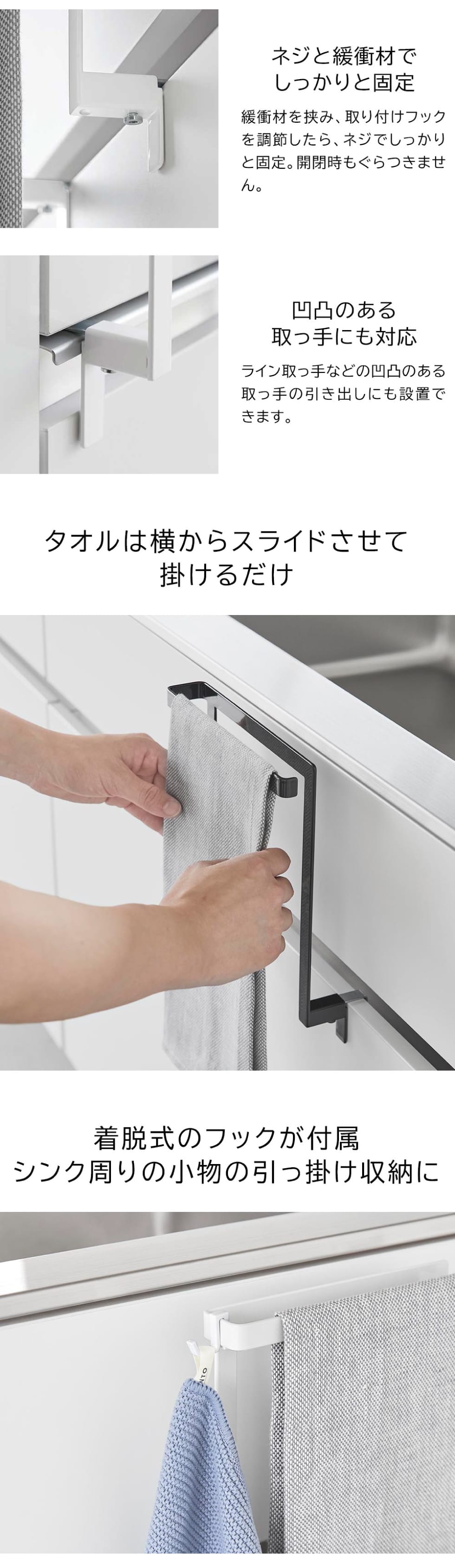 シンク下の引き出しや扉に設置できる、タオルの巻き込みを防ぐタオルハンガーです。設置部分から手前の15cm高い位置にバーがあるので、開閉時もタオルを巻き込みません。扉の厚さは1.4~2.5cmまで、凹凸がある取っ手の引き出しにも緩衝材で対応しており、設置箇所の厚みに合わせて調整ネジで簡単に取り付け可能。腰を曲げずに濡れた手を拭くことができ、引き出しや扉の表面とタオルが触れにくいので、風通し良く衛生的にお使いいただけます。タオルは横からかけられるので取り替えもスムーズ、フック付きでちょっとした小物も掛けられて便利です。