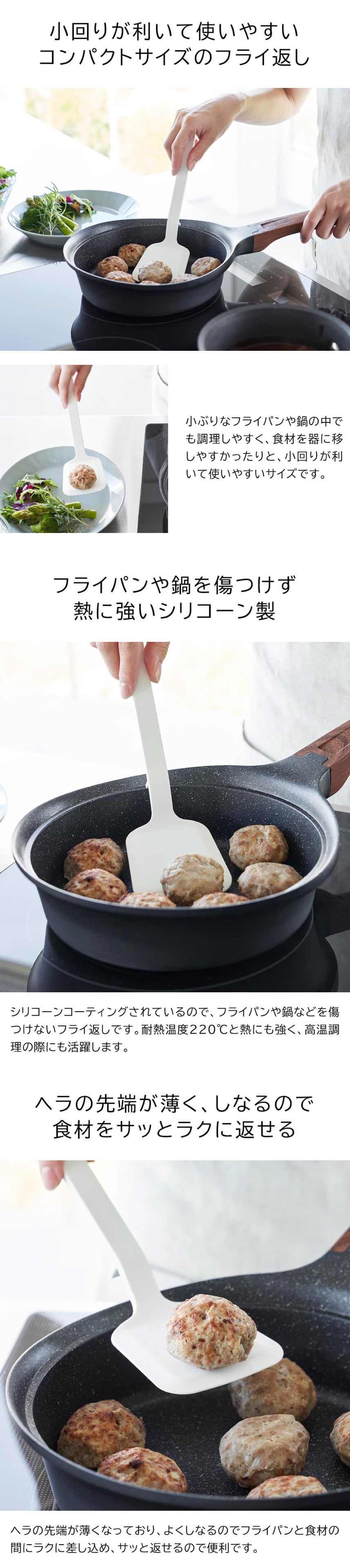 フライパンや鍋を傷つけない、熱にも強いシリコーン製のフライ返し。使いやすいコンパクトなサイズ。置くと先端が浮くので直置きにならず清潔です。食洗機対応。