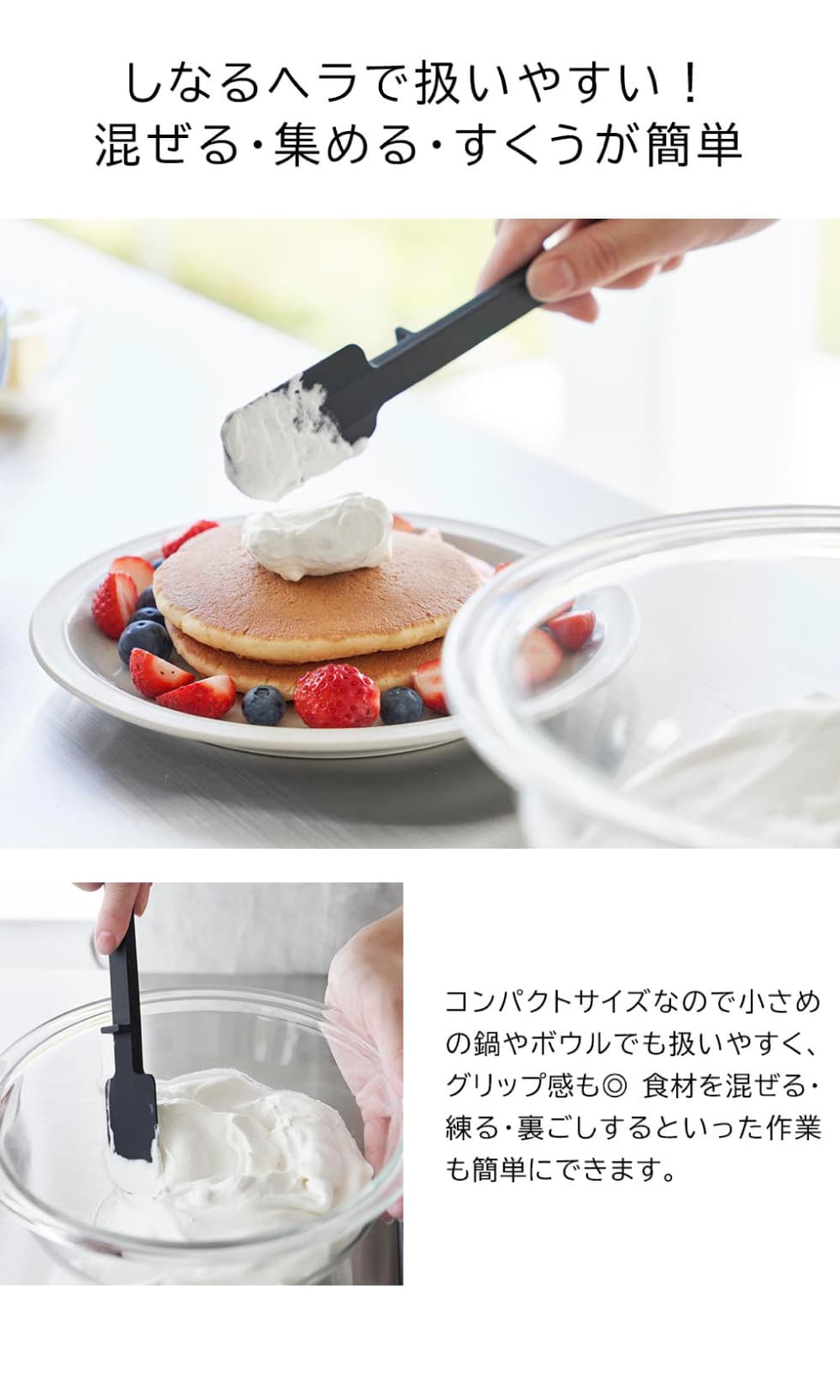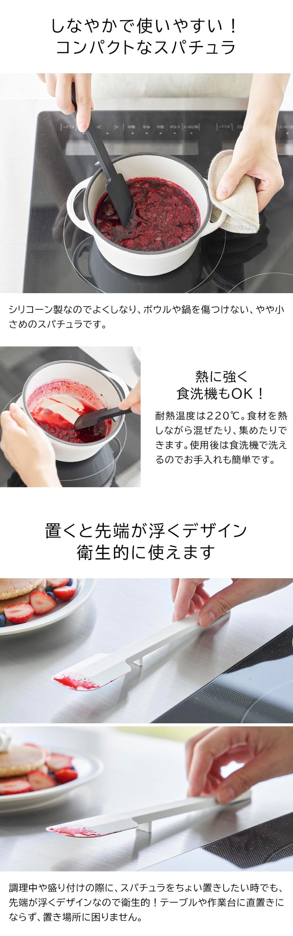 シリコーン製で滑りにくく熱に強い、コンパクトで使いやすいサイズのヘラです。シリコーンコーティングされているのでボウルや鍋などをキズつけません。食材を混ぜたり、練ったり裏ごしする時に便利。ヘラがしなるので簡単に集められ、きれいにすくい取ることができます。先端が浮くので直置きにならずに清潔。食洗機OK。