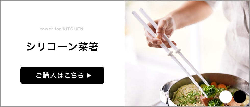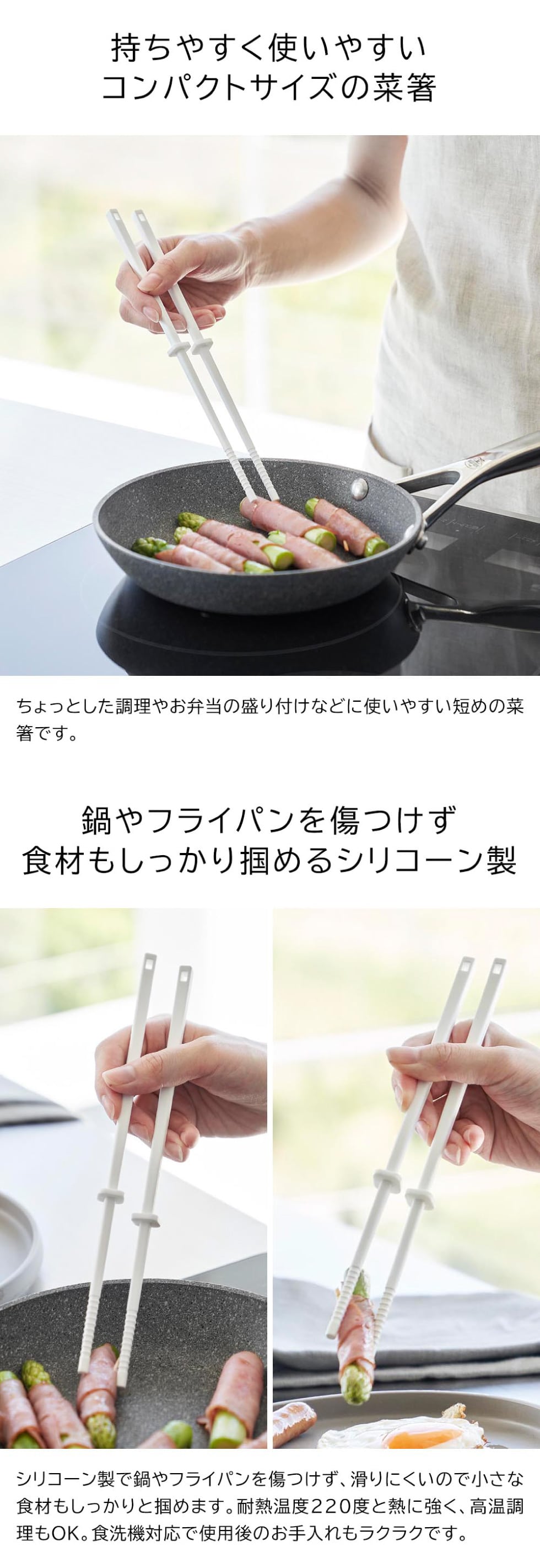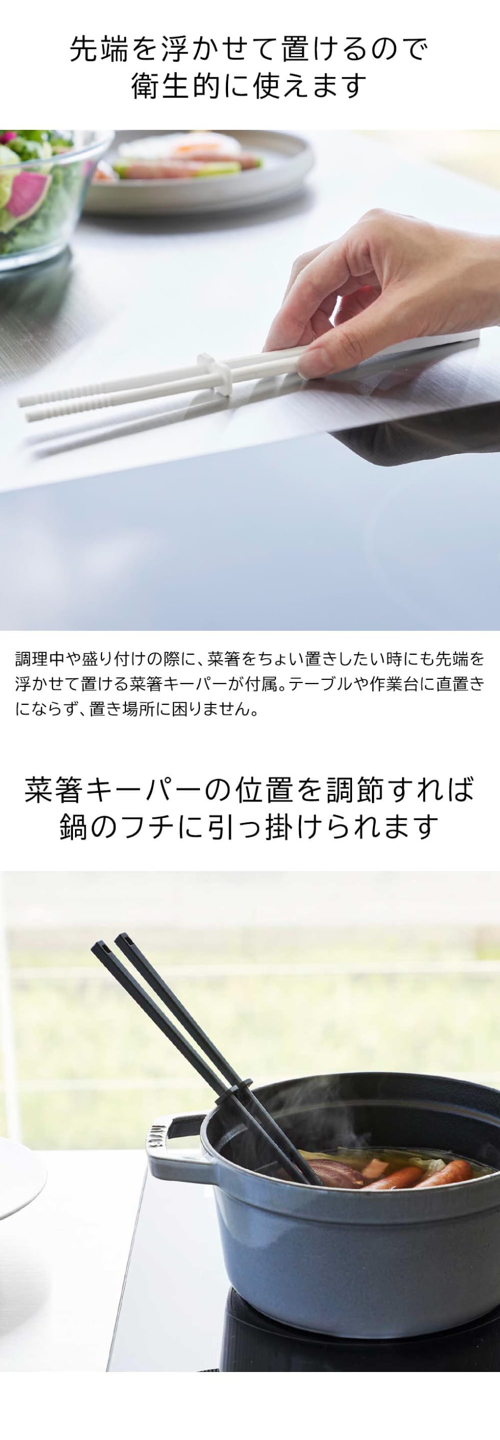 シリコーン製で滑りにくく熱に強い、コンパクトで使いやすいサイズの菜箸です。菜箸の先を浮かせて置ける菜箸キーパー付きなので、直置きにならずに清潔。菜箸キーパーの位置調節で、お鍋のふちに引っ掛けることもできます。小さい食材なども滑りにくくしっかりつかめます。食洗機OK。
