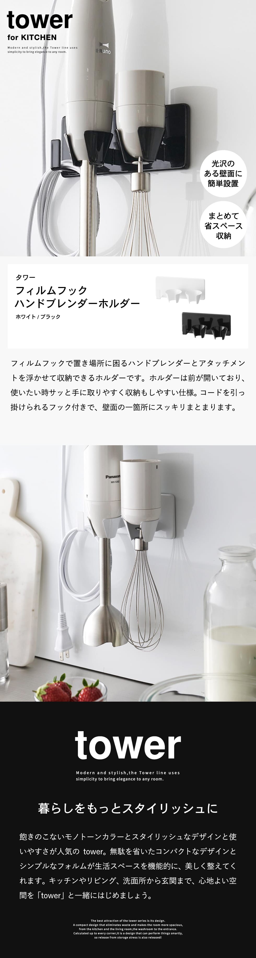 (土・日発送可) フィルムフックハンドブレンダーホルダー タワー 山崎実業 公式 tower 1610 1611 ホワイト ブラック