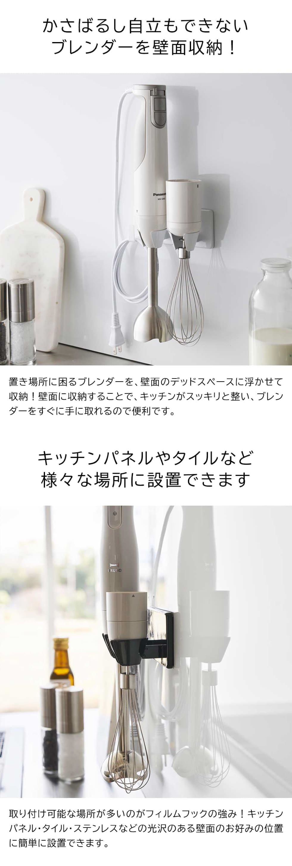 置き場所に困るハンドブレンダーとアタッチメントを、壁面に浮かせて一括収納!フィルムフックでキッチンパネルやタイルなどのお好みの場所に設置。片手でサッと収納できます。