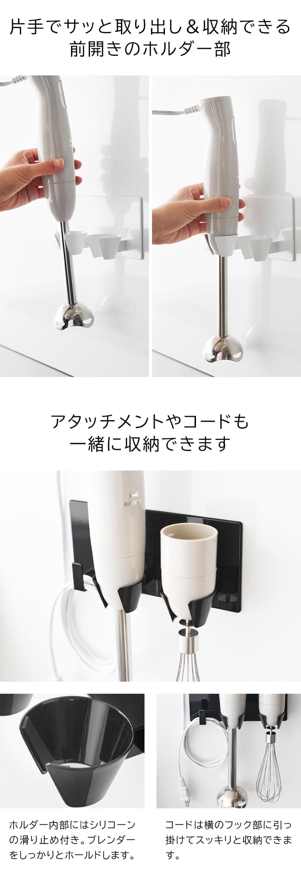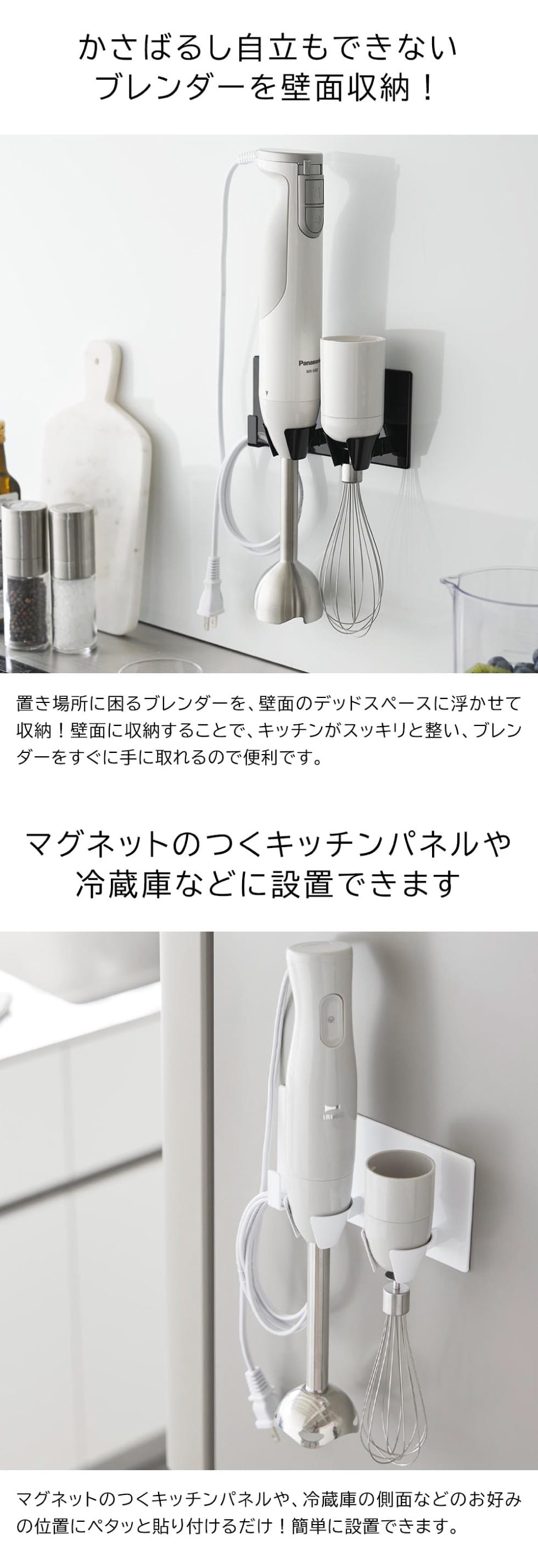 マグネット(磁石)で置き場所に困るハンドブレンダーとアタッチメントを浮かせて収納できるホルダーです。冷蔵庫やキッチンパネルの手に取りやすく邪魔にならない位置にくっつけるだけで設置完了。マグネットなので、高さや場所も簡単に変えられます。ホルダー部分は前が開いており、使いたい時片手でサッと手に取れて収納もしやすい仕様。内部にはシリコーンの滑り止め付きで、しっかりホールドしてくれます。