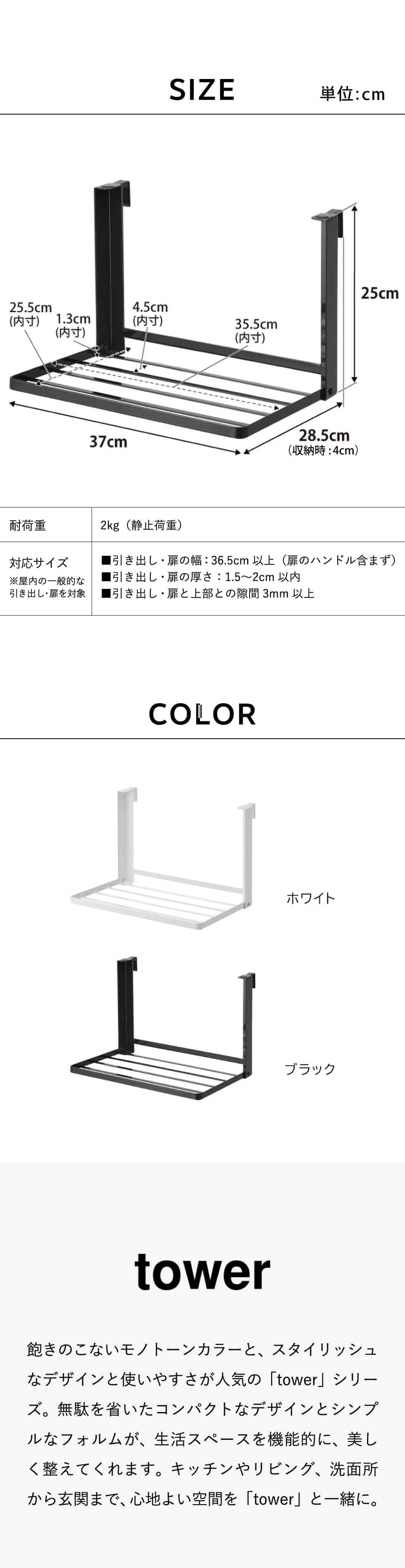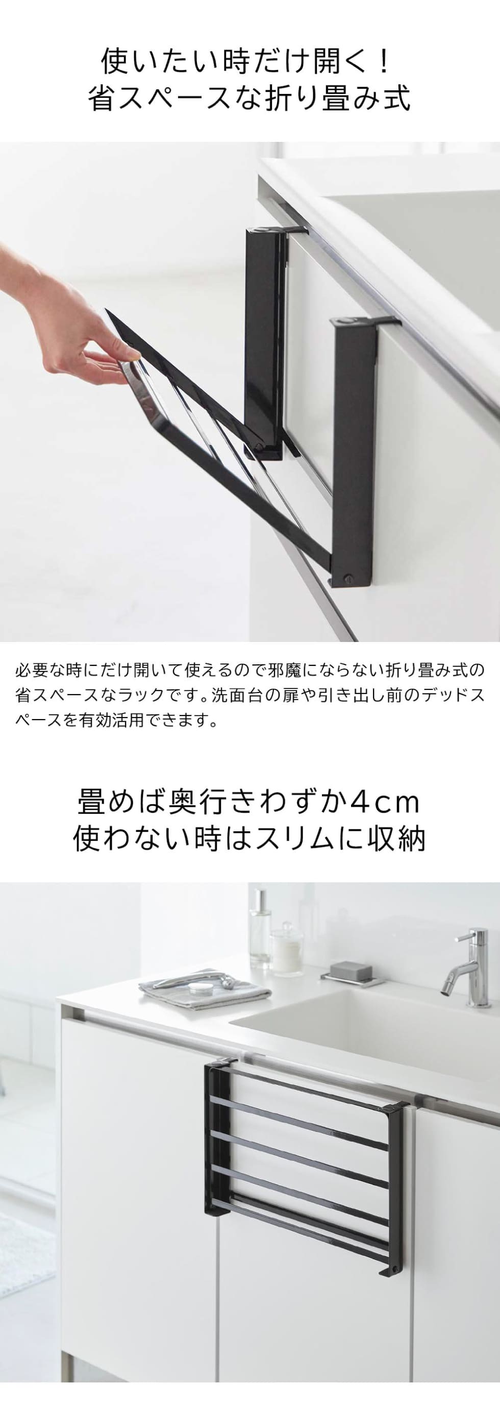 引っ掛けるだけで簡単に設置できる折り畳みラックです。洗面台の扉や引き出しに設置してお風呂上がりのバスタオルや着替えの一時置きにしたり、ランドリーバスケットを置いて洗濯機からの衣類の出し入れをラクにしたりと便利に使えます。折り畳めば奥行きわずか4cmとスリムな設計なので、使わない時も邪魔になりません。厚さ1.5~2cmまでの引き出し・扉に対応しています。
