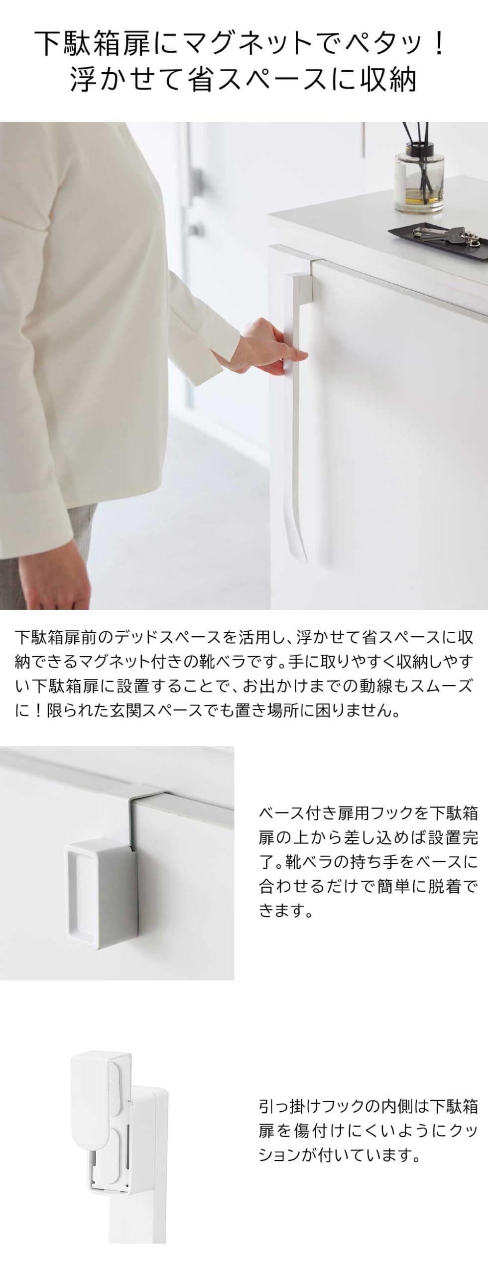 下駄箱扉に浮かせて収納できる靴ベラです。扉に引っ掛けたベースにマグネット内蔵の靴ベラをくっつけて収納します。引っ掛け部分の内側はクッション付きで家具をキズつけにくい仕様です。使いたい時サッと手に取れて、使い終わったらピタッとくっつけるだけなので急いでいる時に便利。椅子に座っても立ったままでも使いやすい長さです。マグネットがつく玄関扉なら、靴ベラを直接貼り付けて収納することもできます。