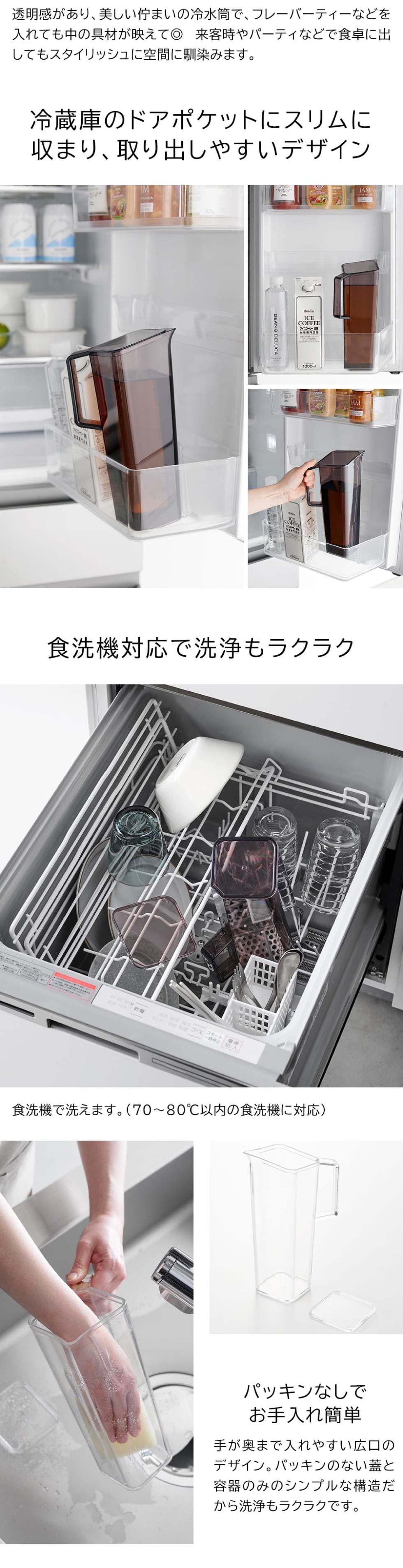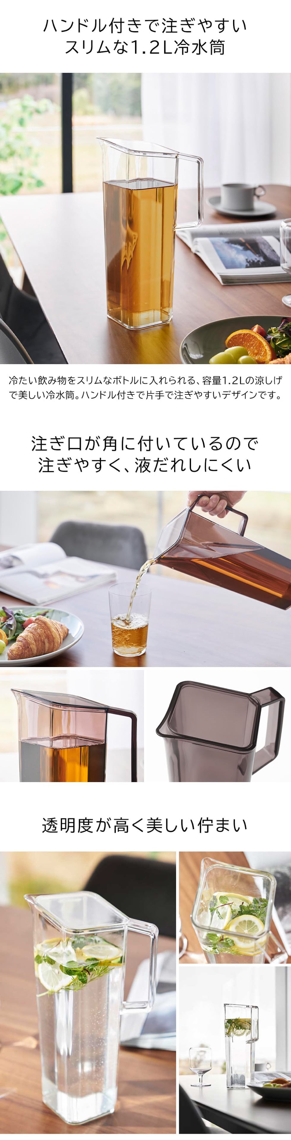 ハンドル付きで片手でも注ぎやすい冷水筒です。注ぎ口が角に付いているので注ぎやすく、注いだあともタレにくい設計。容量は1.2Lとスリムな形状で、冷蔵庫のドアポケットにスッキリ収まります。蓋と容器のみでパッキンなしのシンプルな構造で、手が奥まで入り洗いやすい広口のデザイン。食洗機対応もしているので、お手入れも簡単です。透明度の高い美しい佇まいの冷水筒でフレーバーティーを作れば、見た目もキレイで映えること間違いなしです。