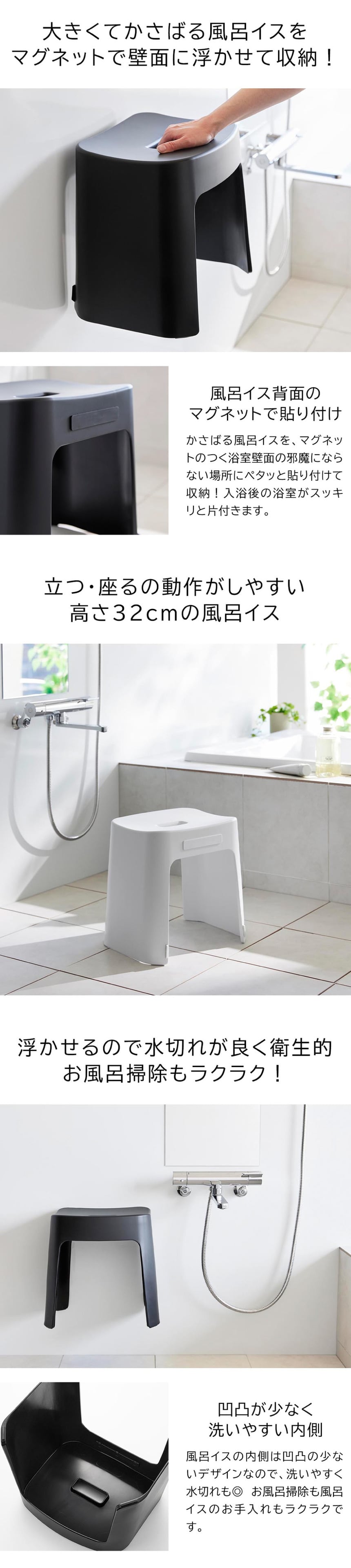 マグネットで浴室の壁面に浮かせて収納できる風呂イスです。座面高は少し高めの32cm。3ヶ所に内蔵された強力マグネットで壁面にピタッとくっつけられます。内側は凹凸が少ないスッキリとしたデザインなので、お手入れも簡単。マグネットは埋め込み式なので壁面への色移りを防ぎます。お風呂の壁をキズつけないように脚にクッションが付いています。壁面収納以外に、浴槽のフチに脚を引っ掛けて収納も可能。浮かせているので乾きも早く、いつでも清潔に保てます。