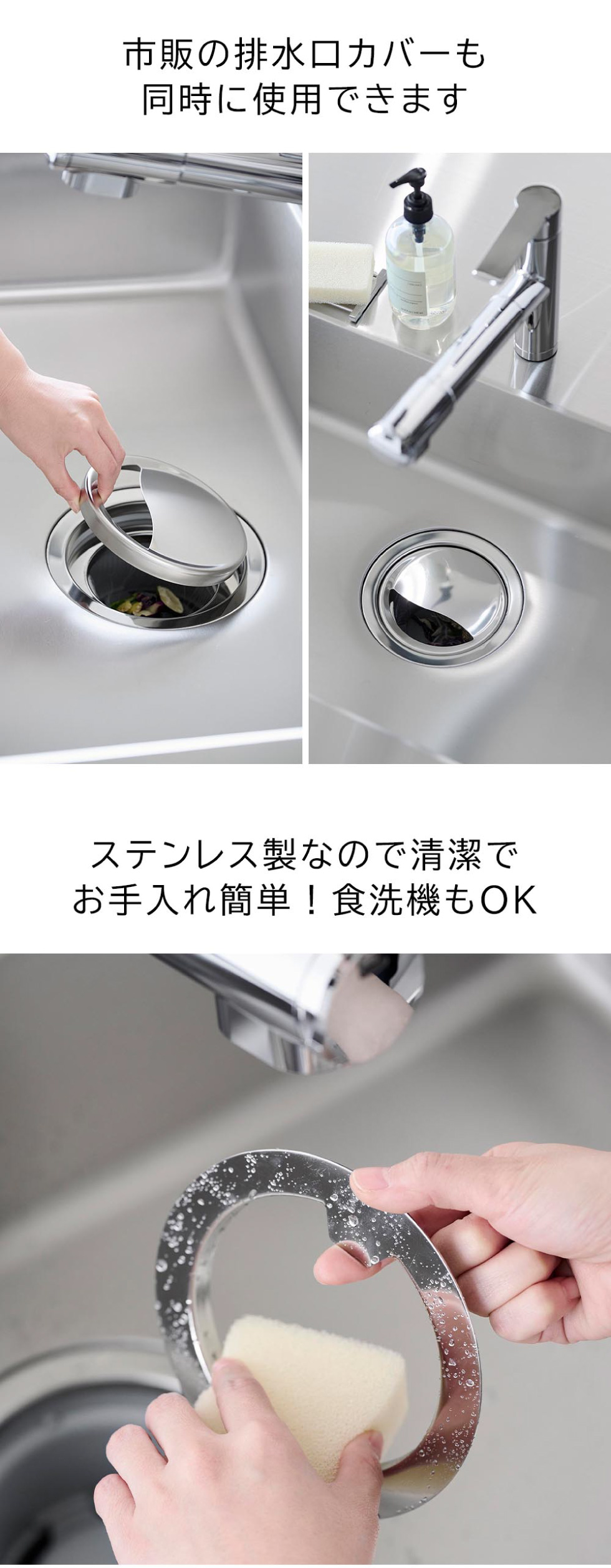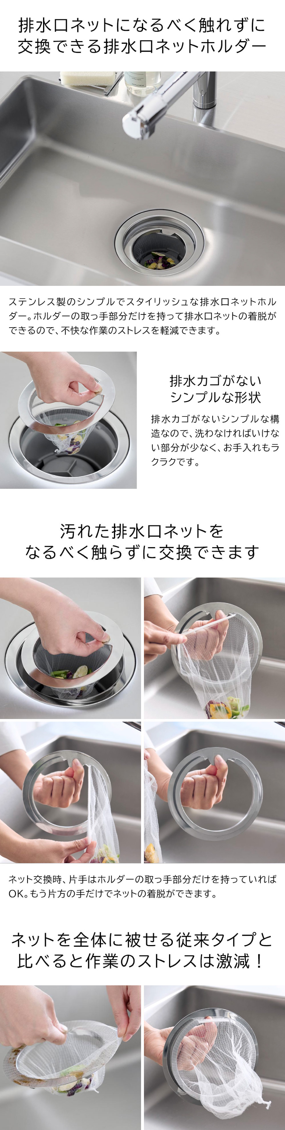 排水口ネットになるべく触れずに交換できる、排水口ネットホルダーです。ホルダーの取っ手部分を持ってネットの着脱ができるので、交換作業中に両手で何度もネットを触れなくても交換ができます。裏側のツメに引っ掛けるため、上からの見た目はスッキリ。シンプルな構造でお手入れもラクラク。ステンレス製で食洗機OKなので、衛生的に保てます。市販の排水口カバーも同時に使用できます。