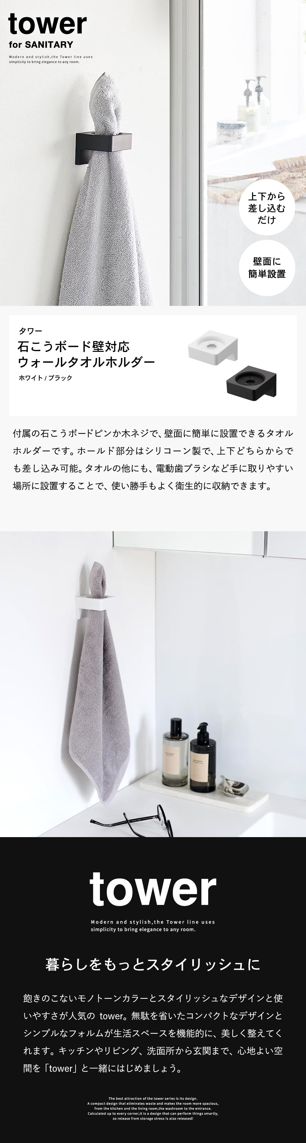 ホワイトとブラックを中心とした飽きのこないモノトーンカラーと、どんなインテリアにもスッと馴染むスタイリッシュなデザイン。そして、とことんシンプルながら、より豊かな暮らしを提案するアイデアがたくさん詰まった、使いやすいアイテムが人気です。無駄を省いたコンパクトなデザインと、シンプルなフォルムが生活スペースを機能的に、美しく整えてくれます。towerのアイテムをライン使いすれば、すっきりとした統一感が生まれ、お洒落でシックな雰囲気を演出します。キッチンやリビング、洗面所から玄関まで揃えたくなるtowerシリーズで、毎日の暮らしを彩る心地よい空間を。