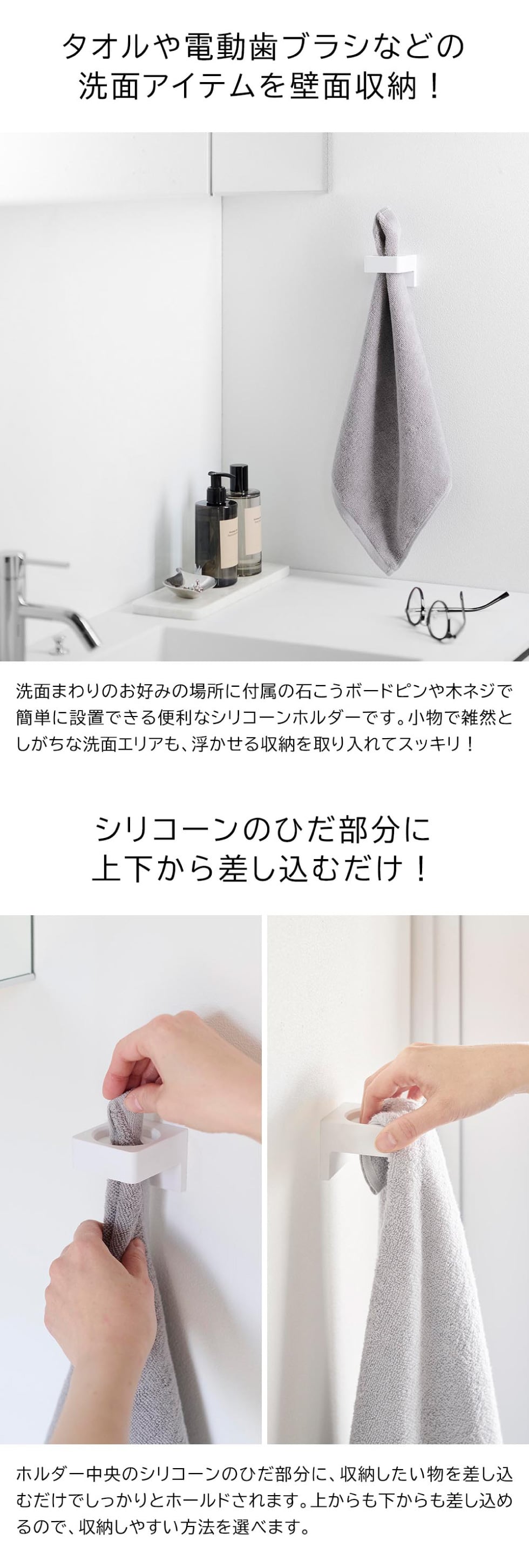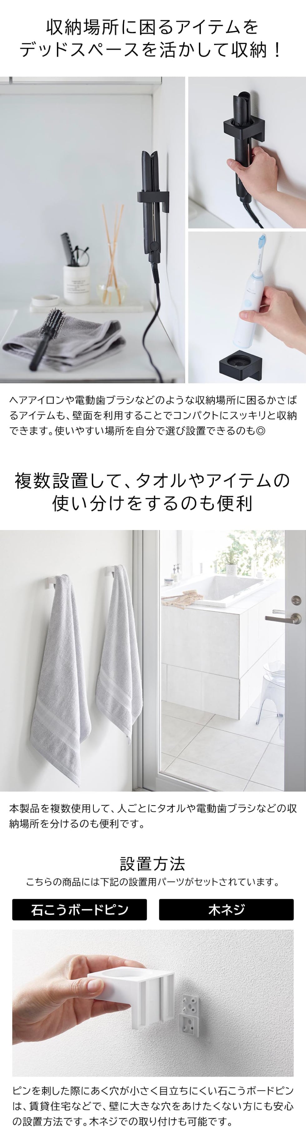 付属の石こうボードピンか木ネジで壁面に簡単に設置できるタオルホルダーです。固定部分はシリコーン製で、上からでも下からでも差し込み可能。バスタオルやフェイスタオルはもちろん、直径2.5cm~3.5cmの電動歯ブラシやヘアアイロンなども浮かせてスッキリ収納できます。複数使いでタオルや歯ブラシを種類ごとや人ごとに使い分けて収納するのも便利です。