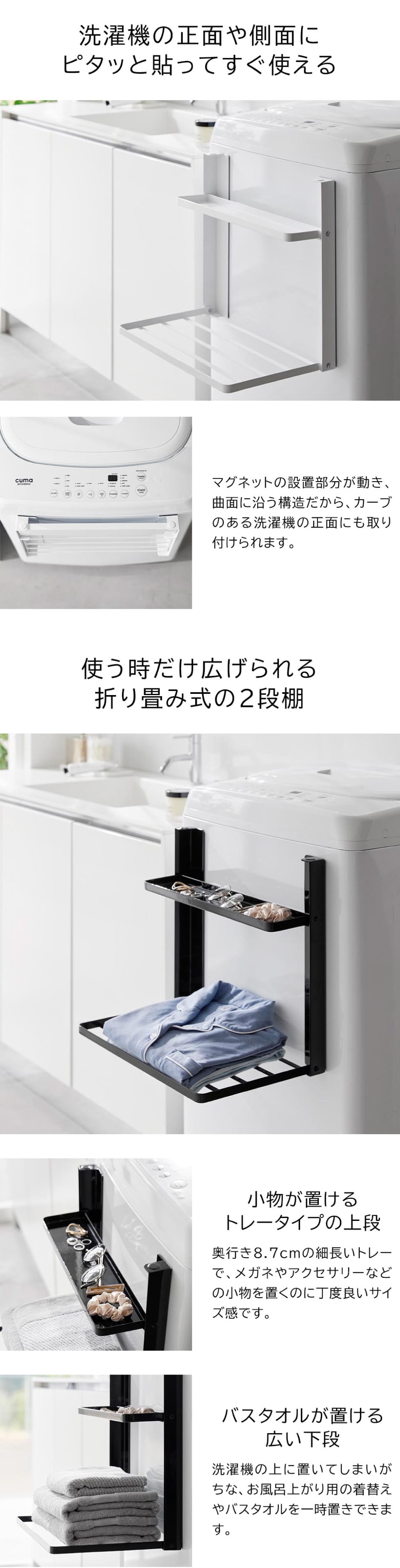 マグネットで洗濯機の正面や側面にピタッと設置できる2段棚です。形状の違う上下の棚を使い分けて、小物やタオルの一時置きに便利。使わない時には畳めて邪魔になりません。