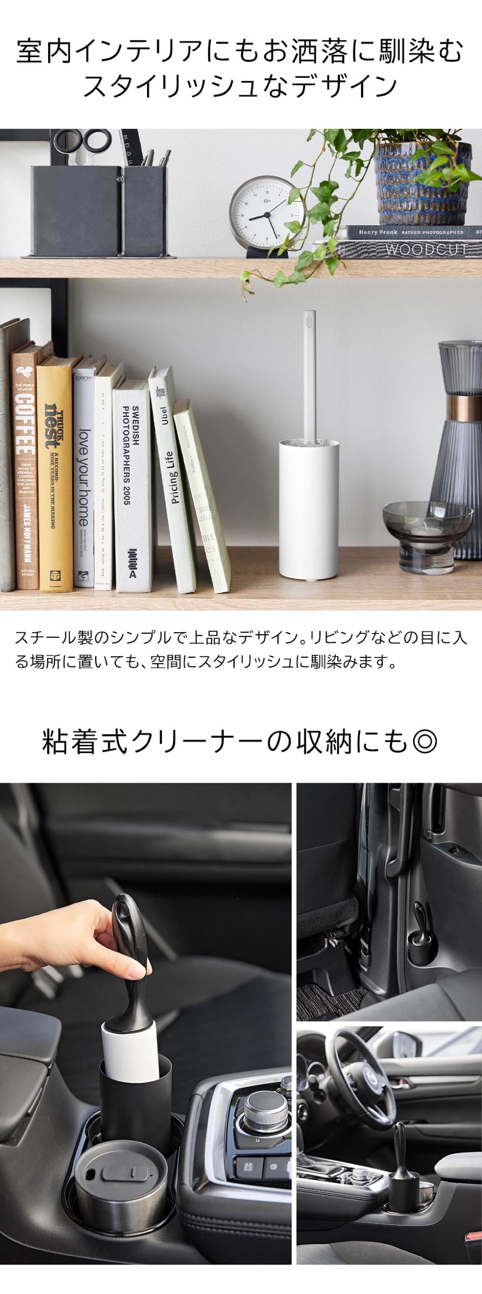 車のドリンクホルダーやドアポケットに収まるボトル型のハンディーモップスタンドです。直径6.8cmのシンプル&スリムな形状で、ダッシュボードやシートについた埃やペットの毛など気になったらサッと取り出してキレイにすることが可能。スチール製の粉体塗装仕上げなので、粘着式クリーナーの収納としても。リビングや寝室など室内で使用するのもおすすめです。