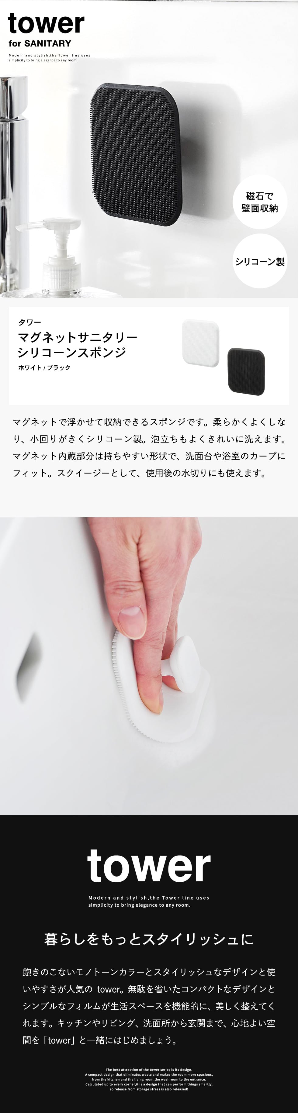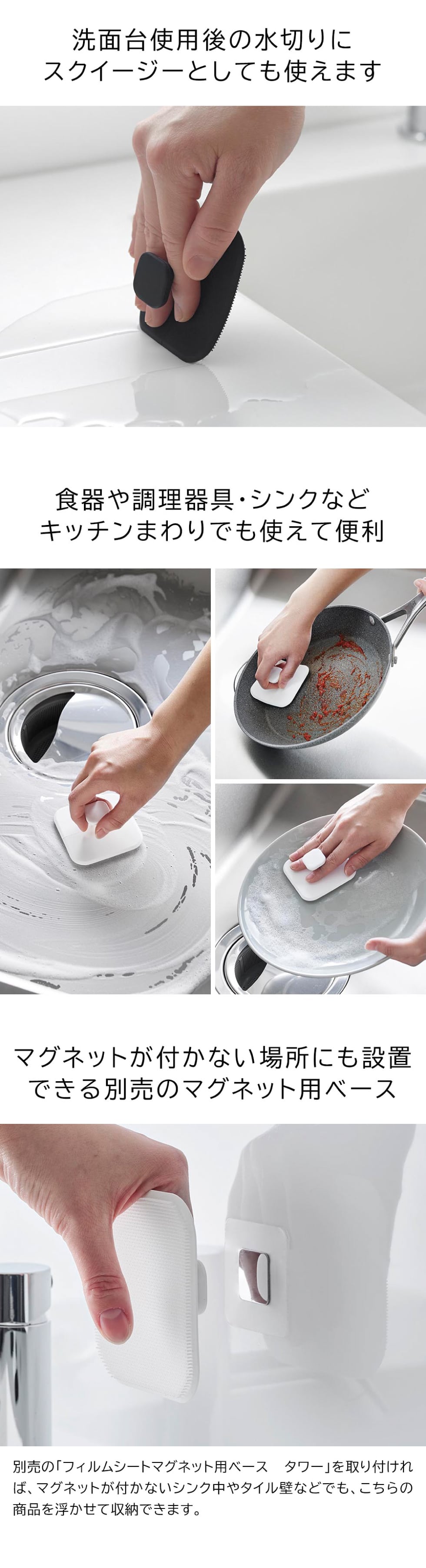 マグネットがつく壁面に簡単設置。小回りがきく柔らかいシリコーン製スポンジです。洗面台では、カーブに沿ってしなやかにフィットするのでしっかり掃除ができます。お風呂の壁面にマグネットで収納できるので、気づいた汚れもサッと手に取り掃除できます。スクイージーとして、洗面のシンク周りの水切りにも。スポンジ面が壁面に触れないので衛生的。別売の(品番:1904)フィルムシートマグネット用ベース タワー シルバーを使用すれば、マグネットがつかない陶器や人工大理石の洗面台、タイルにもマグネット製品が設置できます。