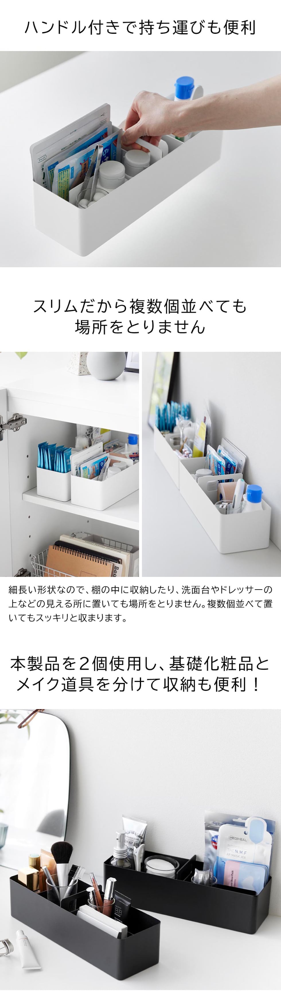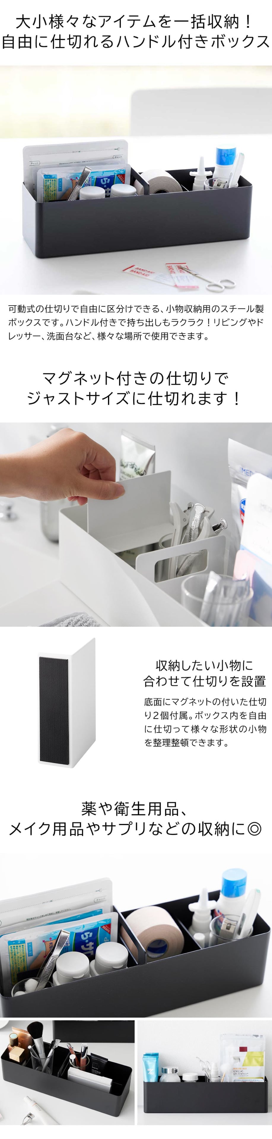 細々した小物の収納に便利なボックスです。仕切りはマグネット付きで収納するモノに合わせて自由に動かすことができるので、薬や湿布、衛生用品を入れて救急箱に。シートマスクやビューラー、ブラシなどメイク用品を入れてメイクボックスにするなど様々な収納に便利です。ハンドル付きで、使う場所への持ち運びや使用後元の場所に戻すのもラクラク。奥行き10cmと並べて置いても場所を取らないスリムな設計なので、複数使いもおすすめです。