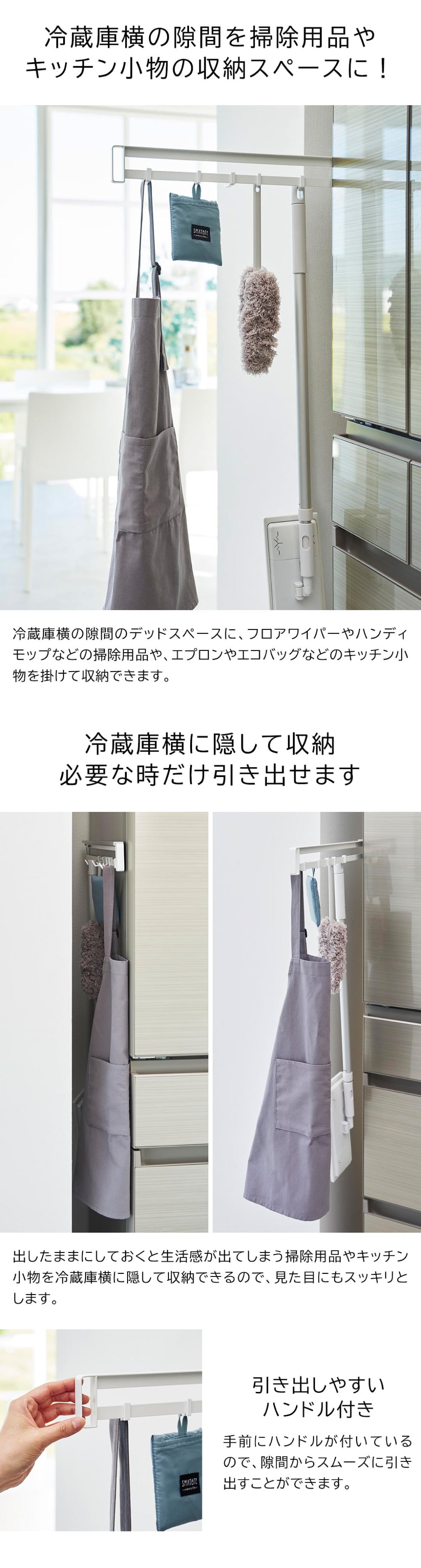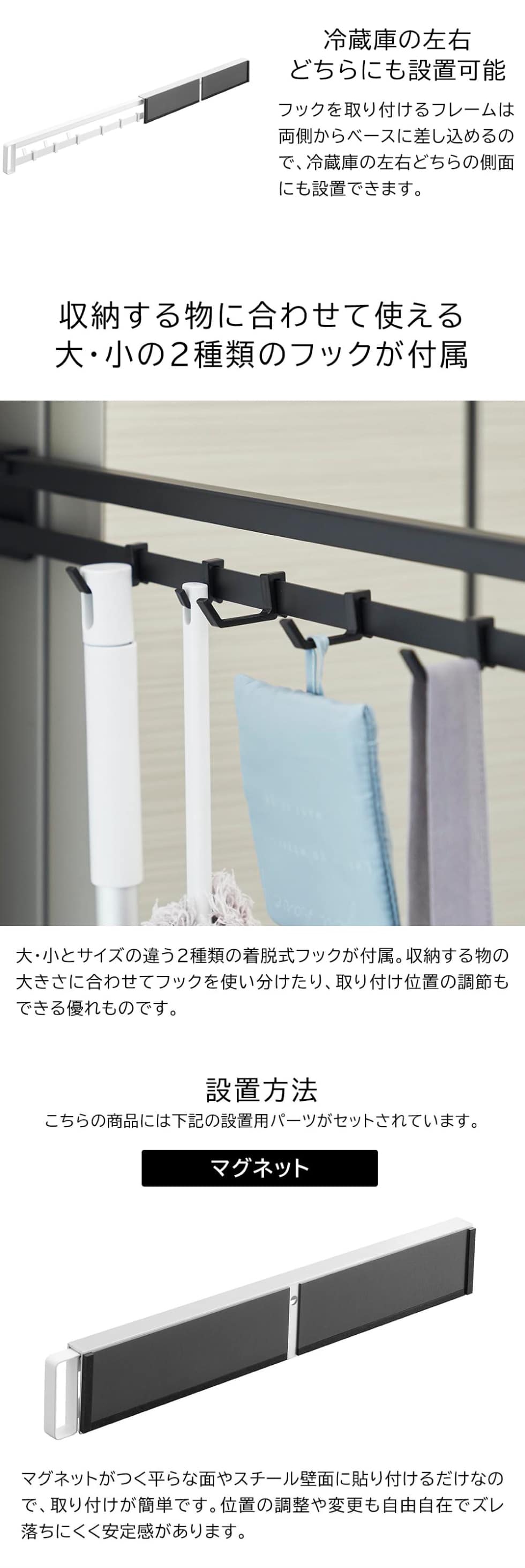 冷蔵庫横にマグネットで取り付けて、必要な時だけ引き出せるスライドフックです。冷蔵庫の左右どちらの側面にも設置可能。大小4つずつフックが付いており、エプロンやフロアワイパー、エコバッグやハンディモップなど、キッチンで使う小物を引っ掛けて収納できます。普段は隠しておけるので見た目もスッキリです。