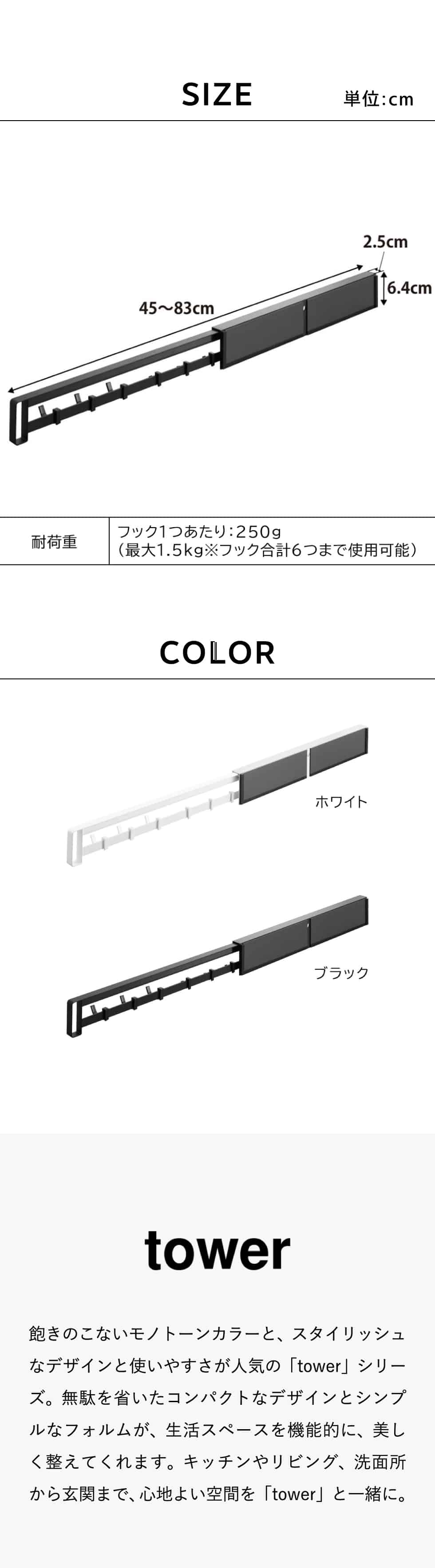 耐荷重 フック1つあたり:250g(最大1.5kg ※フック合計6つまで使用可能) |