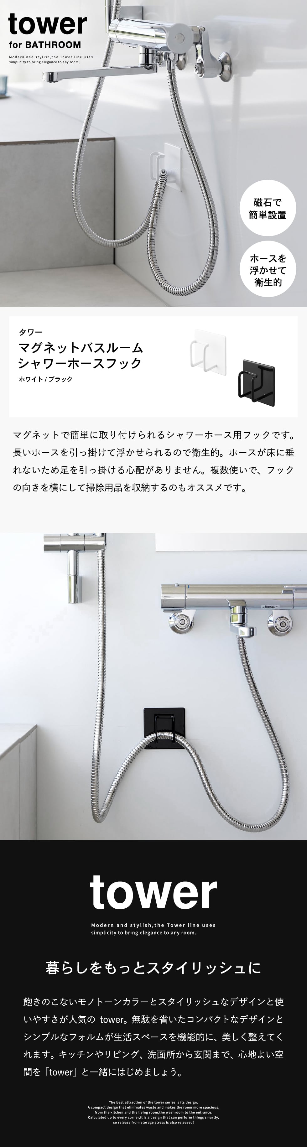 ホワイトとブラックを中心とした飽きのこないモノトーンカラーと、どんなインテリアにもスッと馴染むスタイリッシュなデザイン。そして、とことんシンプルながら、より豊かな暮らしを提案するアイデアがたくさん詰まった、使いやすいアイテムが人気です。無駄を省いたコンパクトなデザインと、シンプルなフォルムが生活スペースを機能的に、美しく整えてくれます。towerのアイテムをライン使いすれば、すっきりとした統一感が生まれ、お洒落でシックな雰囲気を演出します。キッチンやリビング、洗面所から玄関まで揃えたくなるtowerシリーズで、毎日の暮らしを彩る心地よい空間を。