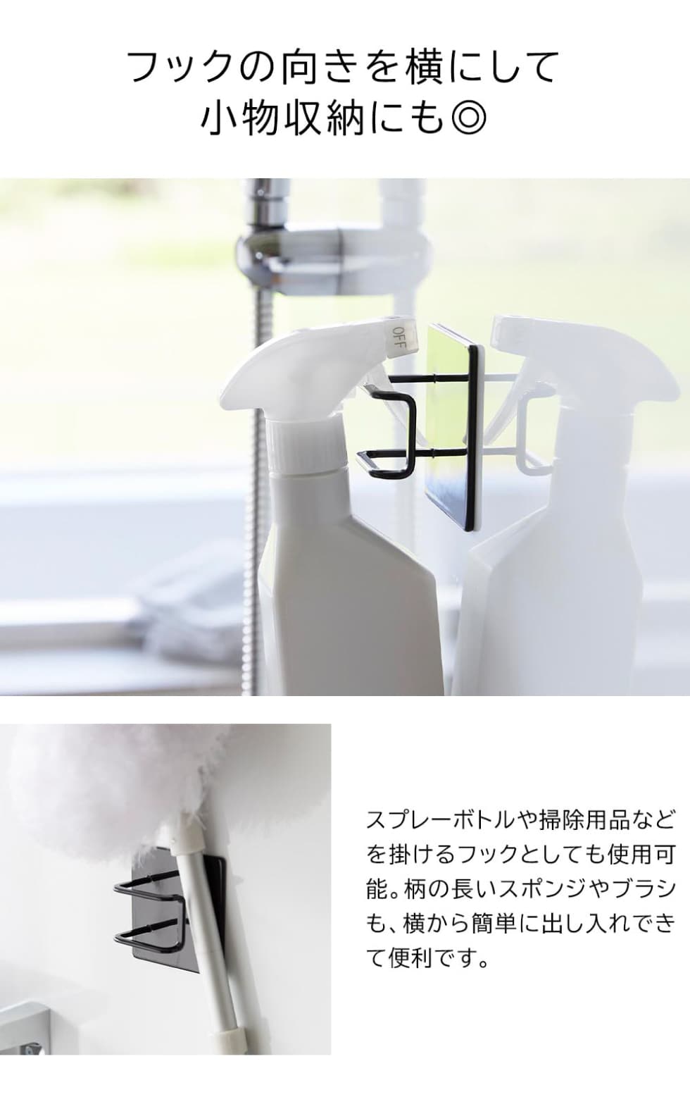 マグネットで簡単に取り付けられるシャワーホース用フックです。長いシャワーホースを浮かせられるので、衛生的に収納可能。ホースが床に垂れないため、足を引っ掛ける心配がなくなり、お子様の転倒防止アイテムとしてもおすすめです。フックの向きを横にして、スプレーやブラシなどの掃除用品を収納するフックとしても便利です。