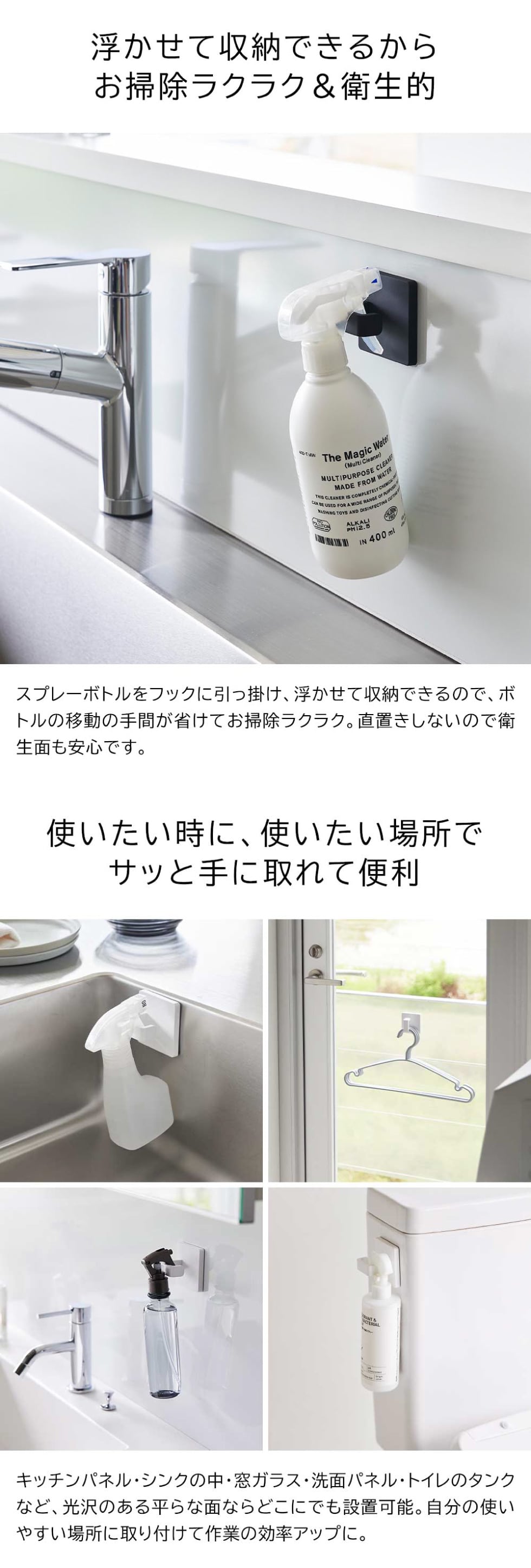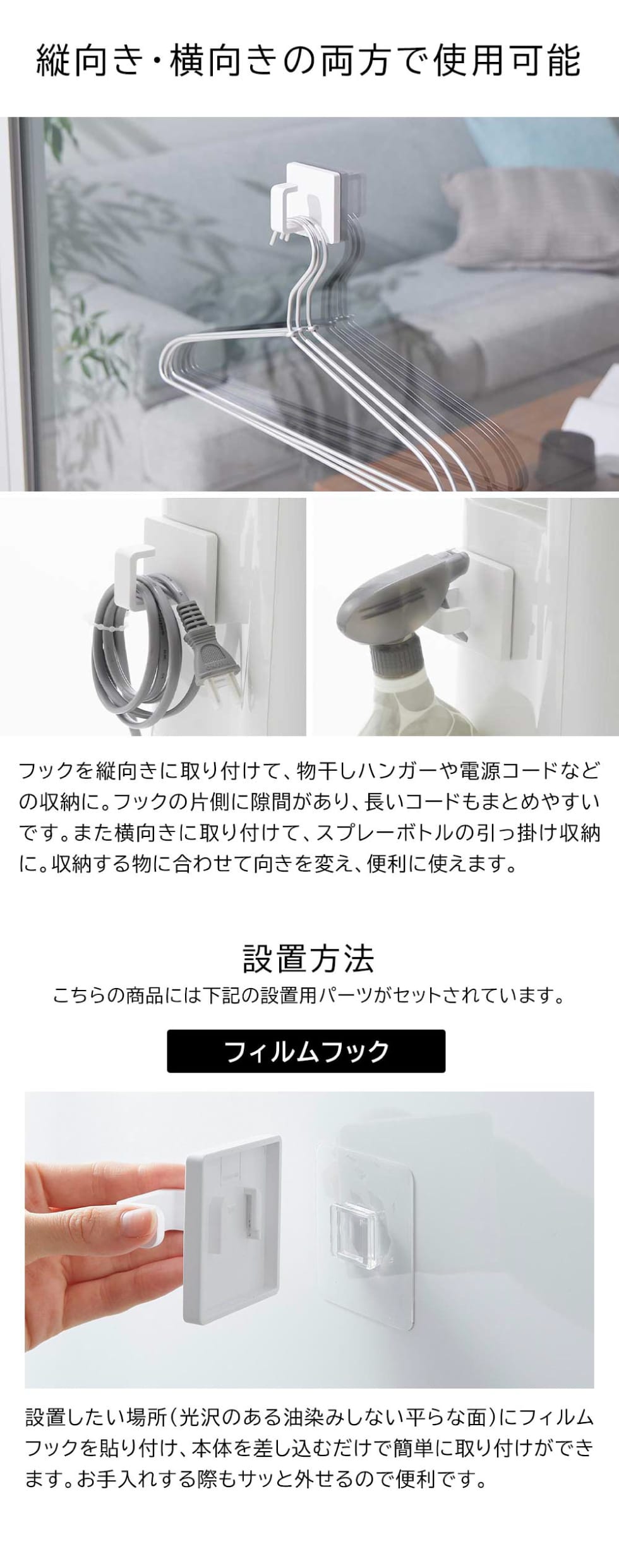 フィルムフックで簡単取り付け!お好みの場所に設置できるので、スプレー類やハンガーなど使いたい時にサッと手に取れて便利です。キッチンやシンク中にスプレーボトルを浮かせて収納できるので衛生的です。トイレ横に設置して消臭剤をひっかけておくこともできます。ランドリールームやベランダなどに縦向きに設置すれば、ハンガー収納として使用でき、洗濯物を干すときにに便利です。設置は、貼り付けたフィルムフックに本体を取り付けるだけ。
