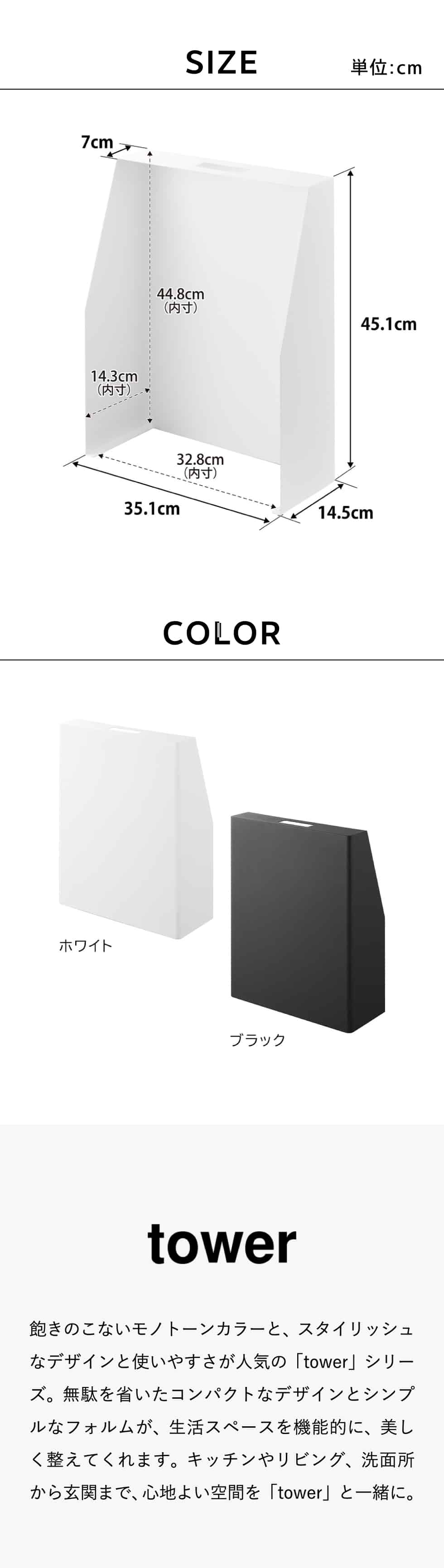 ホワイトとブラックを中心とした飽きのこないモノトーンカラーと、どんなインテリアにもスッと馴染むスタイリッシュなデザイン。そして、とことんシンプルながら、より豊かな暮らしを提案するアイデアがたくさん詰まった、使いやすいアイテムが人気です。無駄を省いたコンパクトなデザインと、シンプルなフォルムが生活スペースを機能的に、美しく整えてくれます。towerのアイテムをライン使いすれば、すっきりとした統一感が生まれ、お洒落でシックな雰囲気を演出します。キッチンやリビング、洗面所から玄関まで揃えたくなるtowerシリーズで、毎日の暮らしを彩る心地よい空間を。