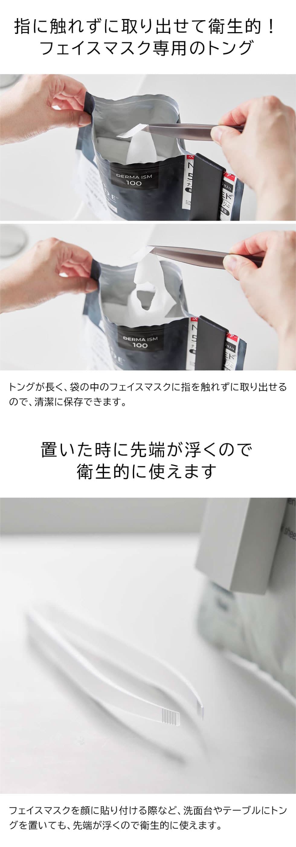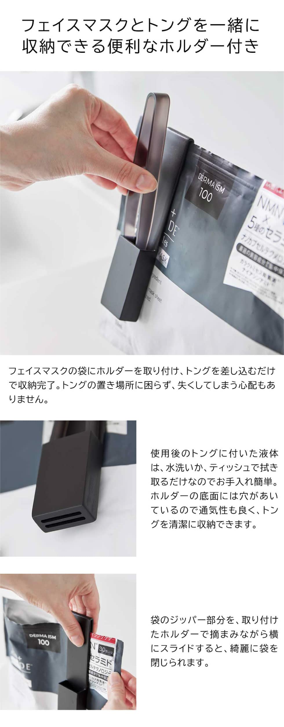 フェイスマスクを衛生的に取り出すことができるホルダー付きトング。フェイスマスクを清潔に保存することができます。使用後はジッパー部分をホルダーで摘みながら横にスライドするだけ。トングは先端が浮いた状態で置くことができ、ホルダーの底面には穴があいているので通気性も良く衛生的に使うことができます。