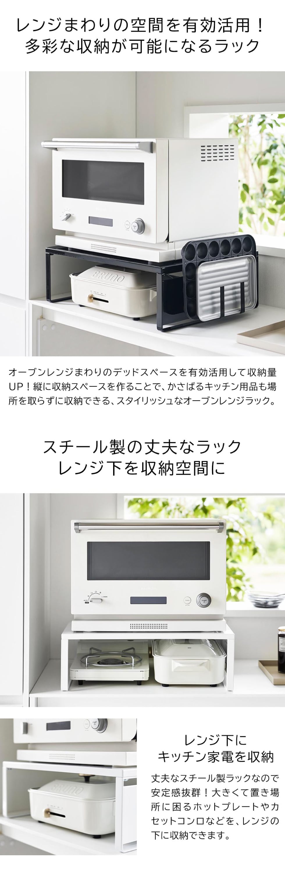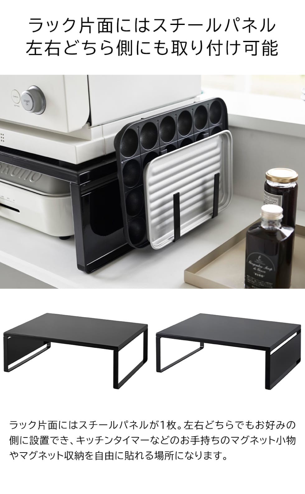 置き場に困るホットプレートやカセットコンロの収納にピッタリです。縦にスペースを作ることで、見た目もスッキリ収納できます。スチールパネルは、キッチンレイアウトに合わせて左右どちらでも取り付け可能です。別売りのキッチントレーホルダー2個組を追加して、オーブンやホットプレートの天板をまとめて収納するのもおすすめです。