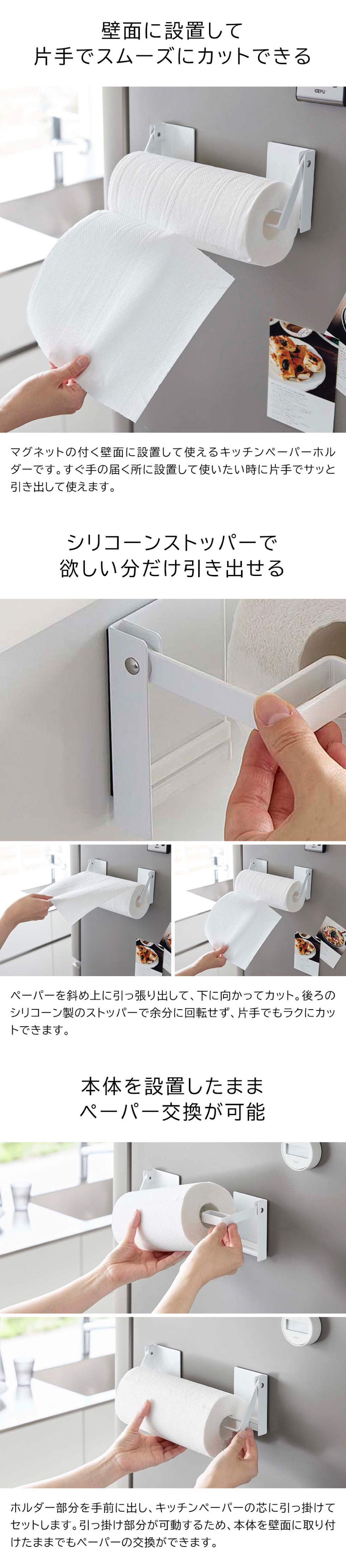 片手でカットできるマグネットキッチンペーパーホルダー。ペーパーの幅に合わせてサイズを調整可能!海外製のキッチンペーパーにも対応。設置したまま簡単にキッチンペーパーを交換できます。キッチンパネルの水回り近くに設置すれば、野菜などの水切りや台拭き時に便利です。コンロ横に設置すれば、油汚れなどの拭き掃除もサッとできて便利です。