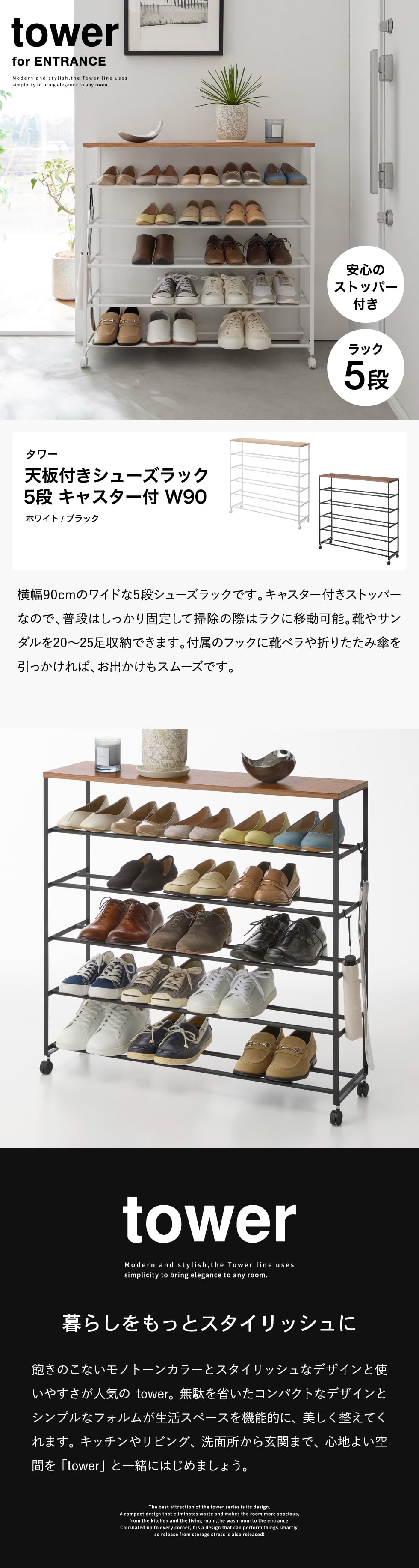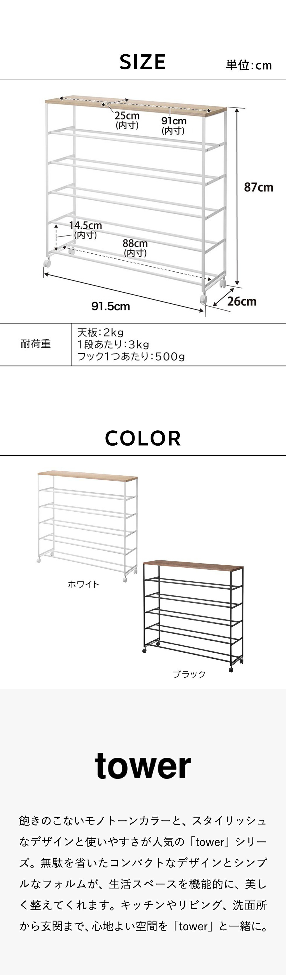 ホワイトとブラックを中心とした飽きのこないモノトーンカラーと、どんなインテリアにもスッと馴染むスタイリッシュなデザイン。そして、とことんシンプルながら、より豊かな暮らしを提案するアイデアがたくさん詰まった、使いやすいアイテムが人気です。無駄を省いたコンパクトなデザインと、シンプルなフォルムが生活スペースを機能的に、美しく整えてくれます。towerのアイテムをライン使いすれば、すっきりとした統一感が生まれ、お洒落でシックな雰囲気を演出します。キッチンやリビング、洗面所から玄関まで揃えたくなるtowerシリーズで、毎日の暮らしを彩る心地よい空間を。
