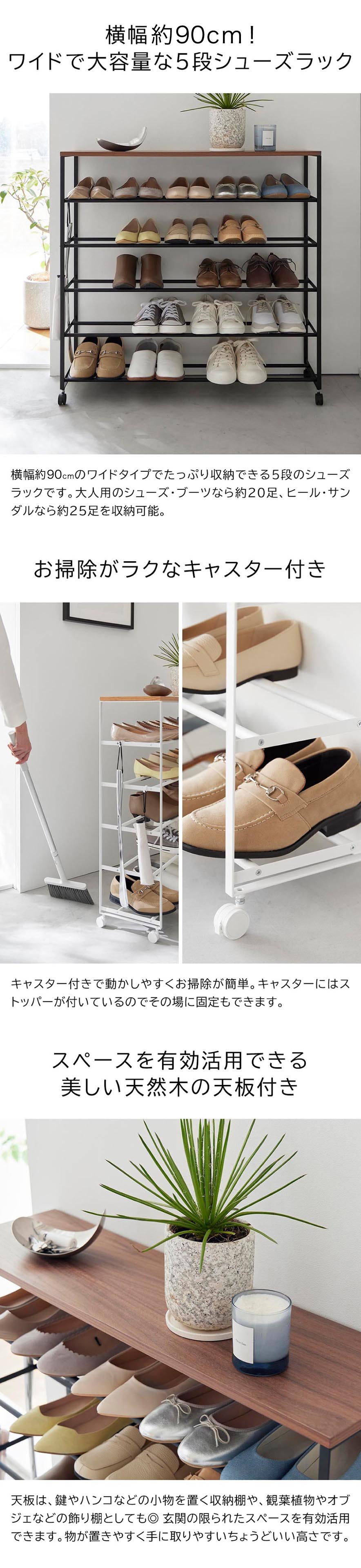 下駄箱に入りきらない靴をまとめて一括収納。横幅90cmのワイドで大容量の天板付きシューズラック5段キャスター付き。エントランスにも馴染むスチールと木の組み合わせがスタイリッシュなデザインです。ストッパー付きのキャスターで、動かしやすく掃除が簡単。天板付きなので鍵や小物、郵便物などを置く棚としても使用できます。付属のフックには靴ベラなどを引っ掛けることもできます。