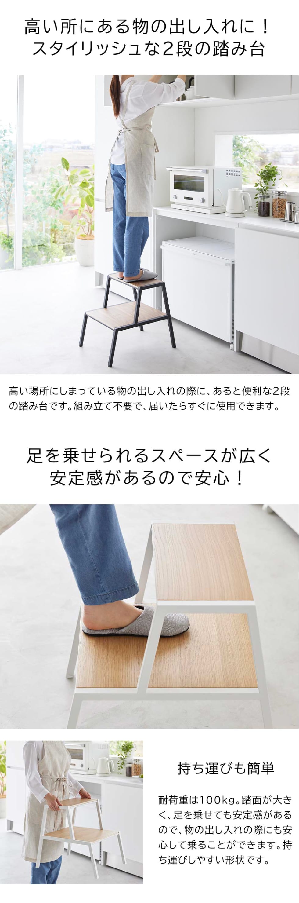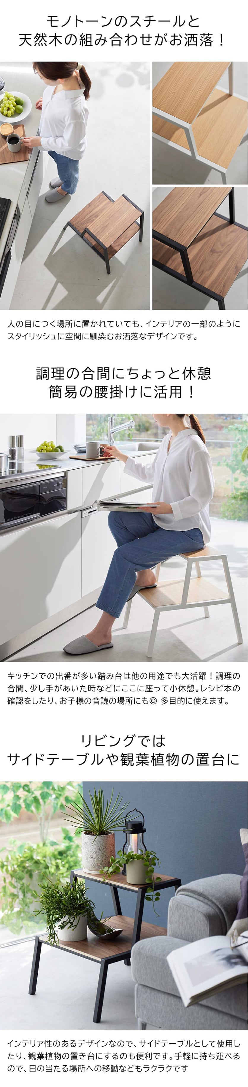 高い場所にある物が取り出しやすく安定感のある大きな踏面の踏み台2段。足を乗せられるスペースが広く安定感があるので安心して使用できます。キッチンではお料理中の作業のサポートや腰掛として。リビングではサイドテーブルや植物の置台としても。インテリアに馴染むスチールと木の組み合わせがオシャレなデザインです。組立不要。