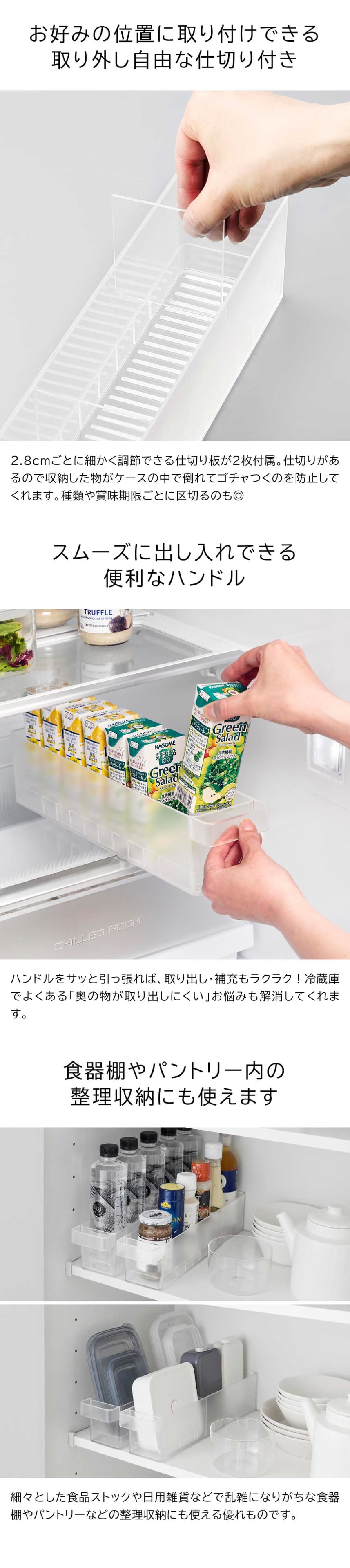 小さな紙パック飲料や乳酸菌飲料などのボトル類を収納できる収納ケースSサイズです。ハンドル付きで奥の物も取り出しやすい仕様。可動式仕切りが2枚付属しており、収納を自由にカスタマイズ可能です。幅7.5cmとスリムな形状なので、複数使いやLサイズと組み合わせるのもおすすめです。冷蔵庫の中以外にも食器棚やパントリー内の整理収納用ケースとしても。