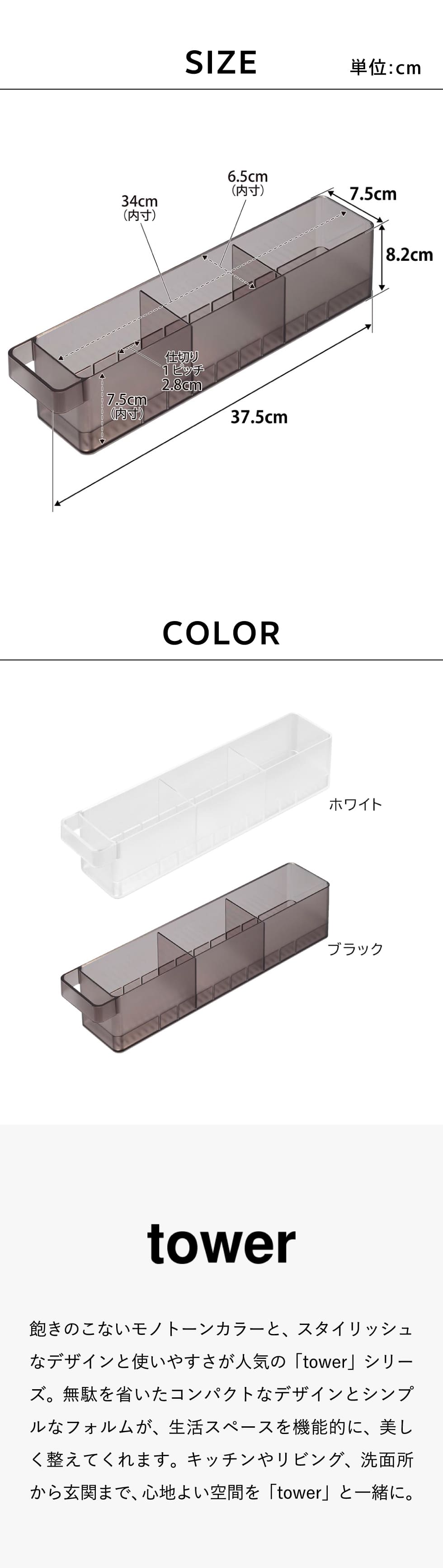 ホワイトとブラックを中心とした飽きのこないモノトーンカラーと、どんなインテリアにもスッと馴染むスタイリッシュなデザイン。そして、とことんシンプルながら、より豊かな暮らしを提案するアイデアがたくさん詰まった、使いやすいアイテムが人気です。無駄を省いたコンパクトなデザインと、シンプルなフォルムが生活スペースを機能的に、美しく整えてくれます。towerのアイテムをライン使いすれば、すっきりとした統一感が生まれ、お洒落でシックな雰囲気を演出します。キッチンやリビング、洗面所から玄関まで揃えたくなるtowerシリーズで、毎日の暮らしを彩る心地よい空間を。
