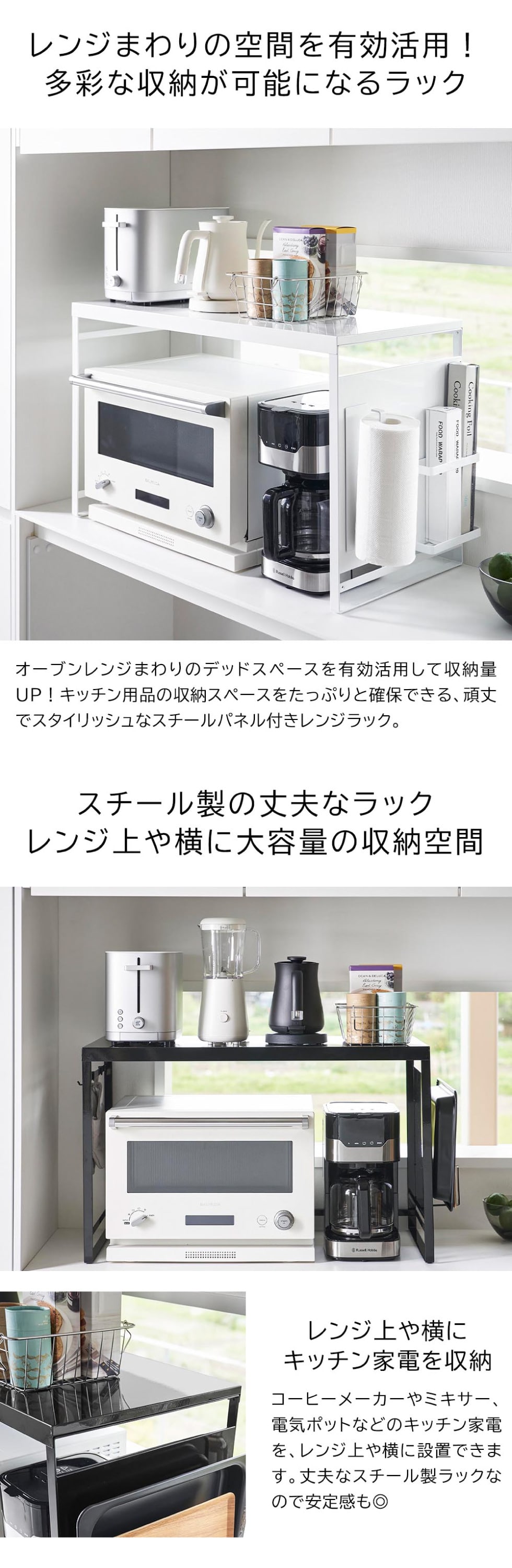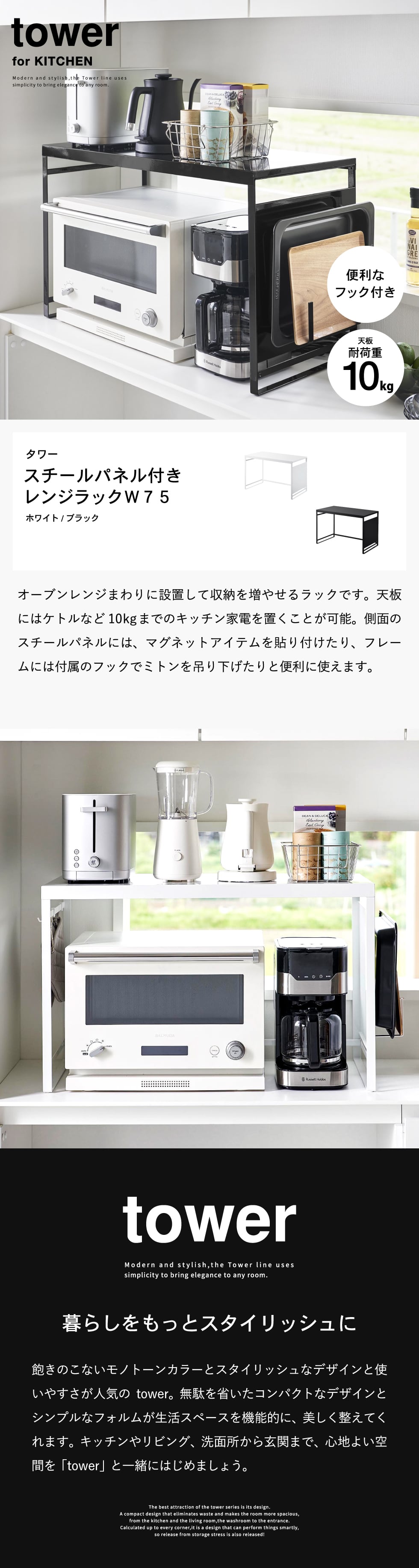 (土・日発送可) スチールパネル付きレンジラック タワー W75 山崎実業 公式 tower 1483 1484 ホワイト ブラック 送料無料