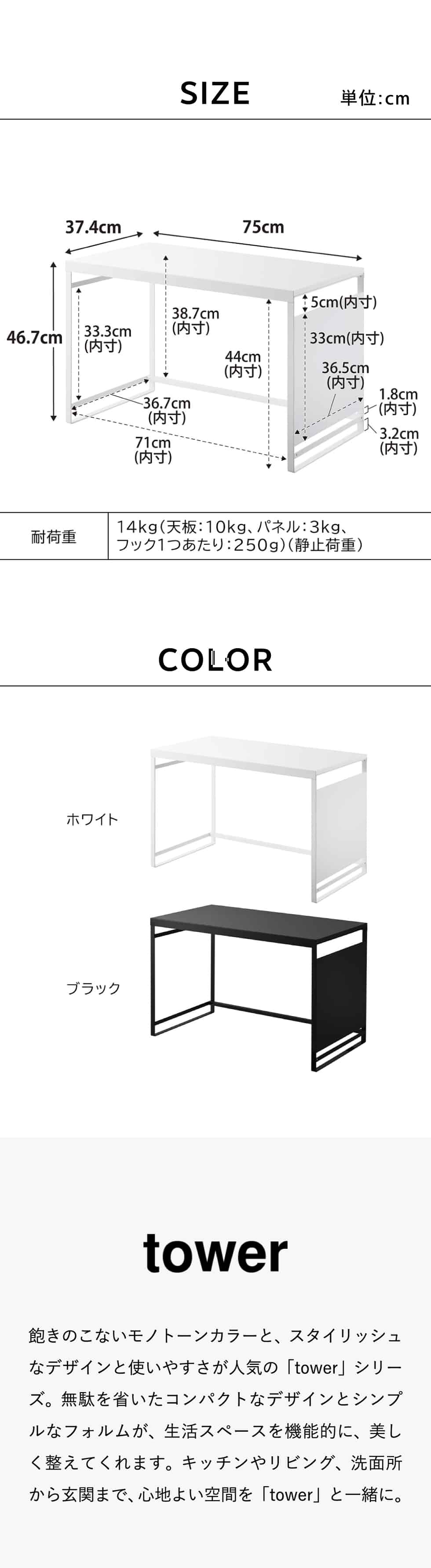 14kg(天板:10kg パネル:3kg フック1つあたり:250g)(静止荷重)