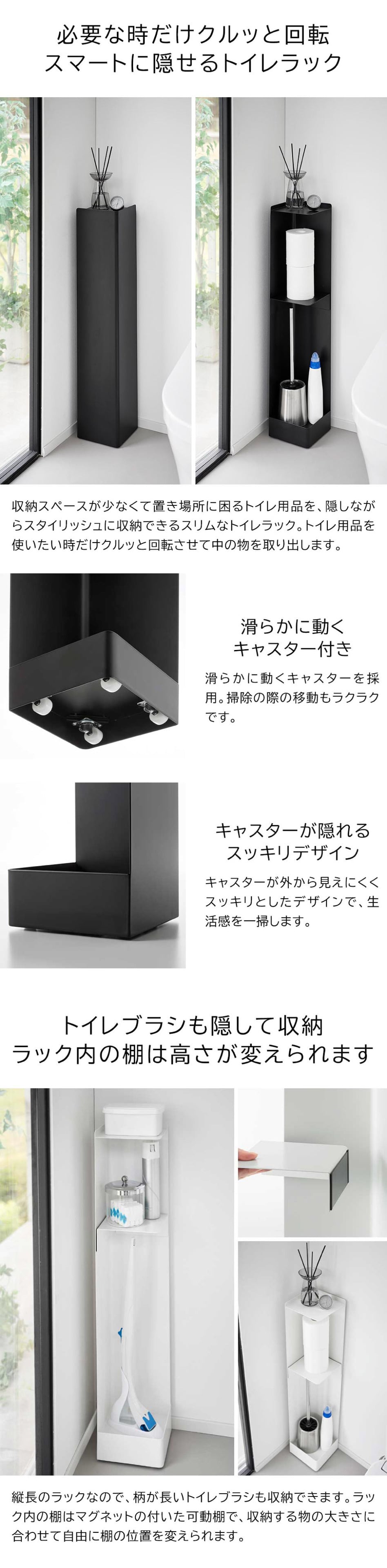 トイレ用品を隠して収納できるキャスター付きスリムトイレラック。狭いスペースでクルっと回転できます。移動がスムーズなハンマーキャスターで、外からは見えないスッキリしたデザインです。移動がスムーズなので掃除もラクラク。マグネット付きの棚板なので高さを自由に変えられます。長いトイレブラシも収納可能。※棚板の荷重600gまで。