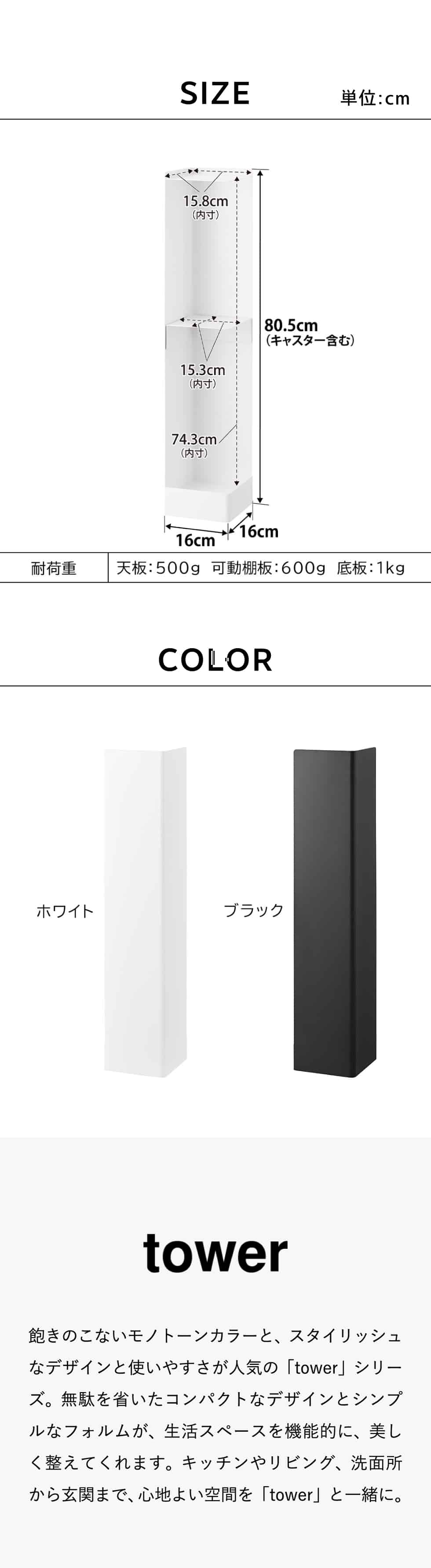 ホワイトとブラックを中心とした飽きのこないモノトーンカラーと、どんなインテリアにもスッと馴染むスタイリッシュなデザイン。そして、とことんシンプルながら、より豊かな暮らしを提案するアイデアがたくさん詰まった、使いやすいアイテムが人気です。無駄を省いたコンパクトなデザインと、シンプルなフォルムが生活スペースを機能的に、美しく整えてくれます。towerのアイテムをライン使いすれば、すっきりとした統一感が生まれ、お洒落でシックな雰囲気を演出します。キッチンやリビング、洗面所から玄関まで揃えたくなるtowerシリーズで、毎日の暮らしを彩る心地よい空間を。
