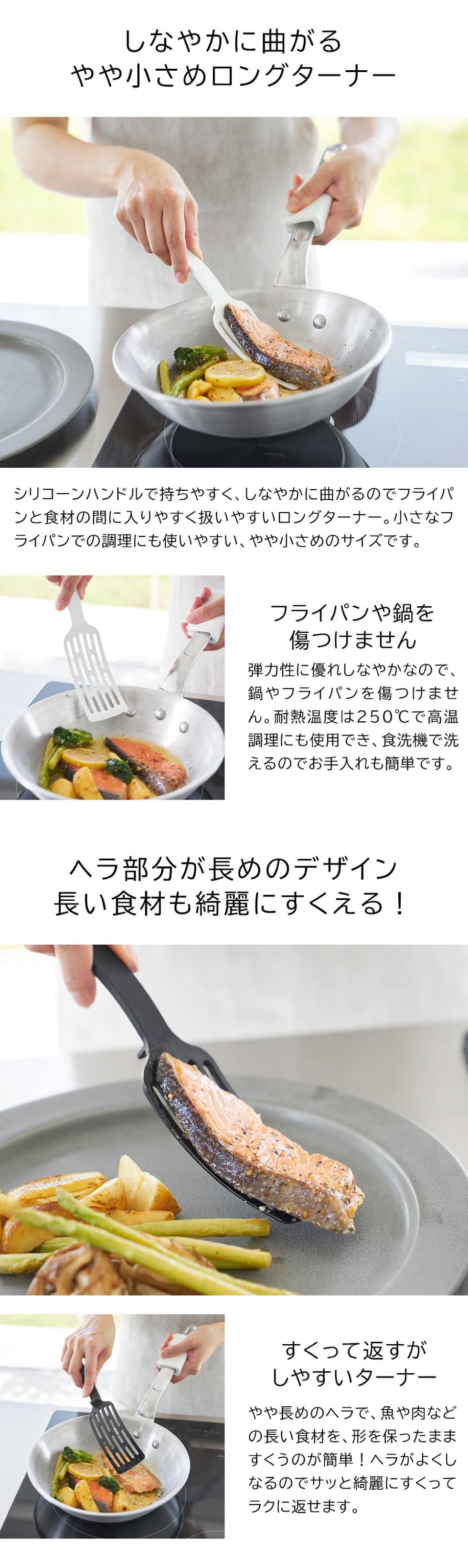 熱に強くしなやかなシリコンターナー。ヘラが長めで長い食材を綺麗にすくえます。小さなフライパンでも使いやすいSサイズ フライパンを傷めず食洗機対応 先端が浮いて衛生的