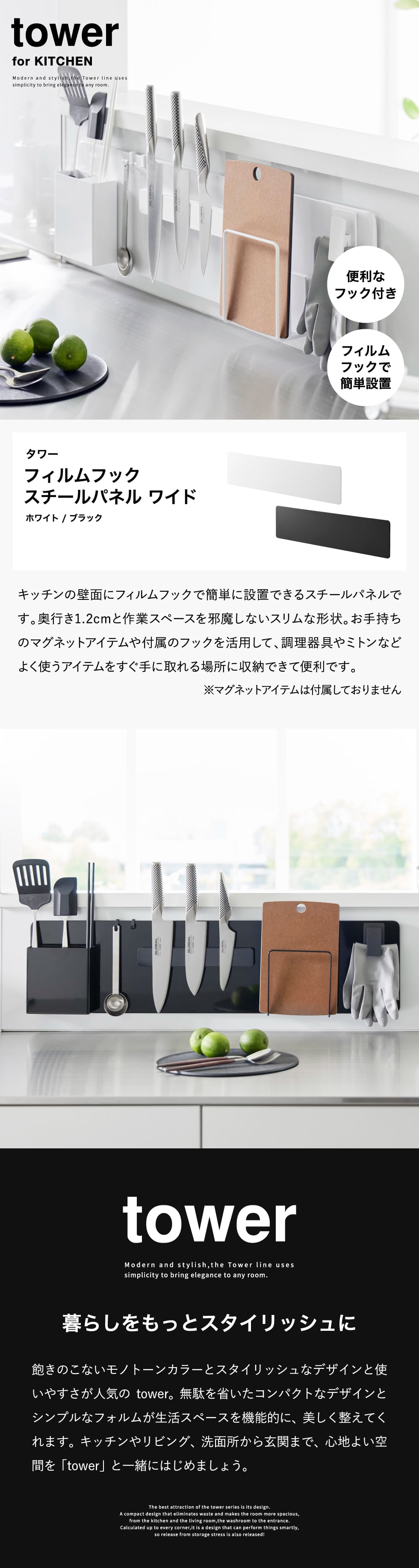 ホワイトとブラックを中心とした飽きのこないモノトーンカラーと、どんなインテリアにもスッと馴染むスタイリッシュなデザイン。そして、とことんシンプルながら、より豊かな暮らしを提案するアイデアがたくさん詰まった、使いやすいアイテムが人気です。無駄を省いたコンパクトなデザインと、シンプルなフォルムが生活スペースを機能的に、美しく整えてくれます。towerのアイテムをライン使いすれば、すっきりとした統一感が生まれ、お洒落でシックな雰囲気を演出します。キッチンやリビング、洗面所から玄関まで揃えたくなるtowerシリーズで、毎日の暮らしを彩る心地よい空間を。