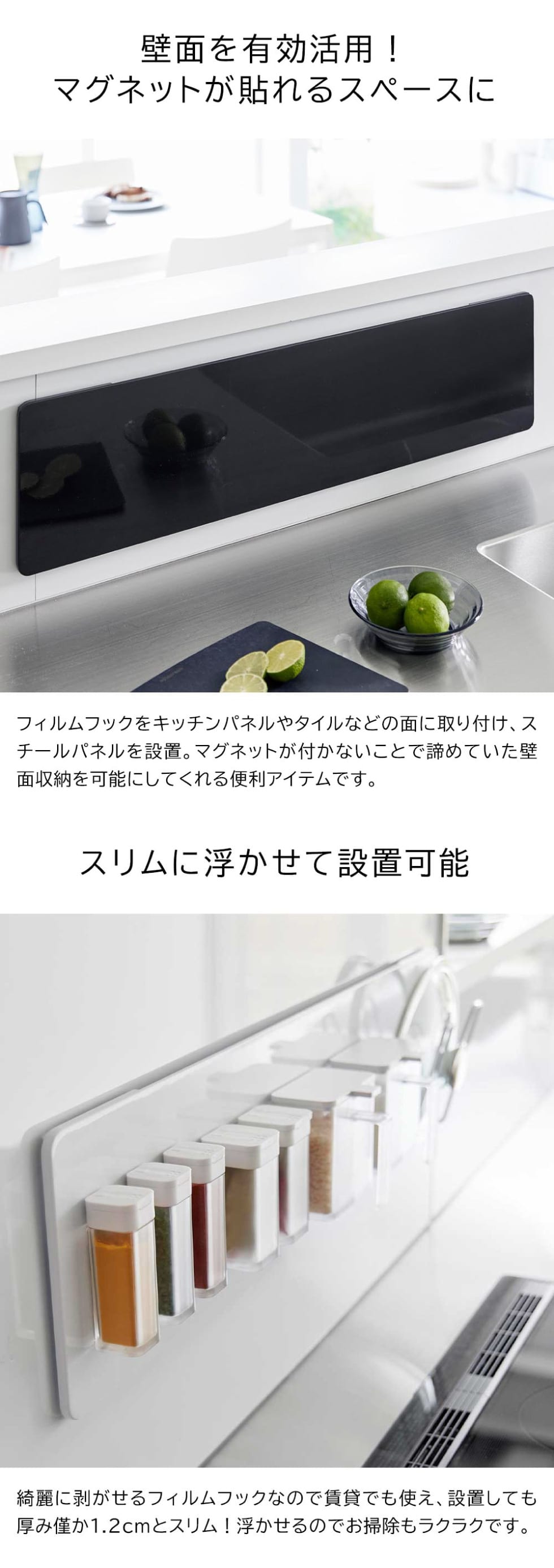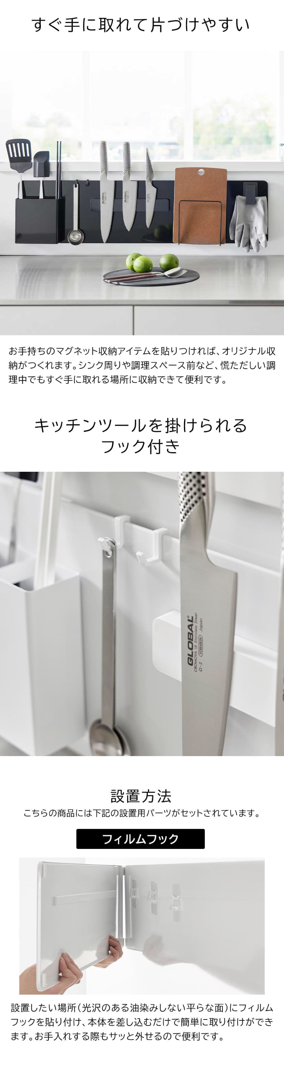 キッチンの壁面にフィルムフックで簡単に設置できるスチールパネルです。奥行き1.2cmと作業スペースを邪魔しないスリムな形状。お手持ちのマグネットアイテムや付属のフックにキッチン小物を掛ければ収納力もアップ。ペーパータオルや調理器具、ミトンなど、よく使うアイテムをすぐ手に取れる場所に収納できます。きれいに剥がせるフィルムフック式は賃貸でも使えて、お掃除も楽です。